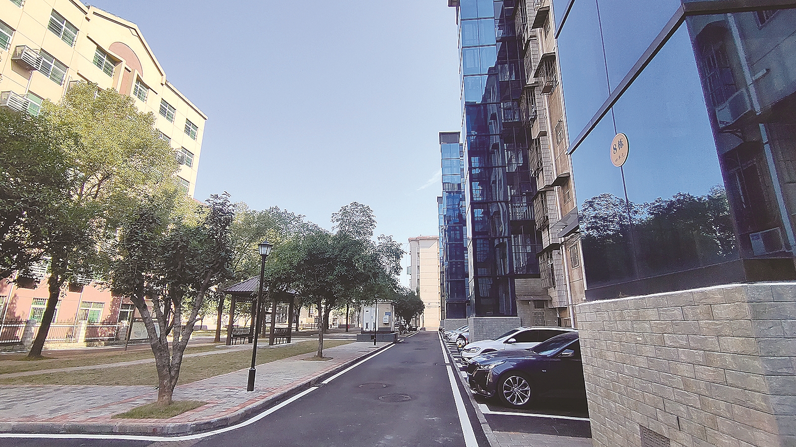 崭新的沥青路面,绿茵茵的大片草地,整齐的白线车位,一尘不染的全新电梯玻璃幕墙,新建的休憩亭台。太阳底下,几个悠闲的老人正晒着太阳。