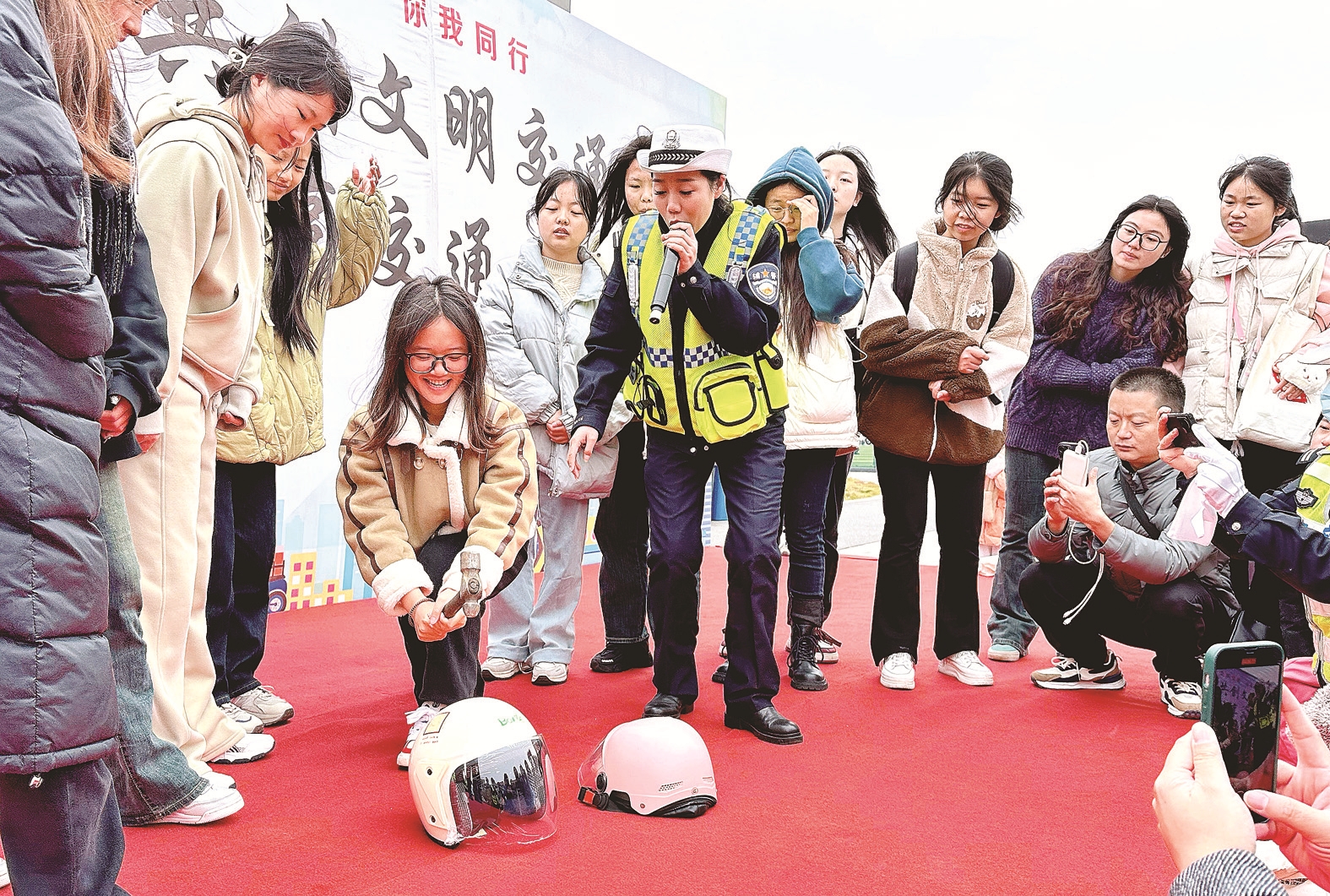 劣质安全头盔和3C标准头盔有哪些区别?如何避开大客车内轮差?小汽车大客车驾驶员盲区到底有多大?酒驾带来哪些安全隐患……11月30日,在“122”全国交通安全日来临之际,一场沉浸式体验的交通安全进校园活动在株洲职教城举行。交警及驾驶员现场讲解安全交通知识,学生排队上来体验,中间还穿插有奖知识问答,吸引了数千名师生踊跃参与。