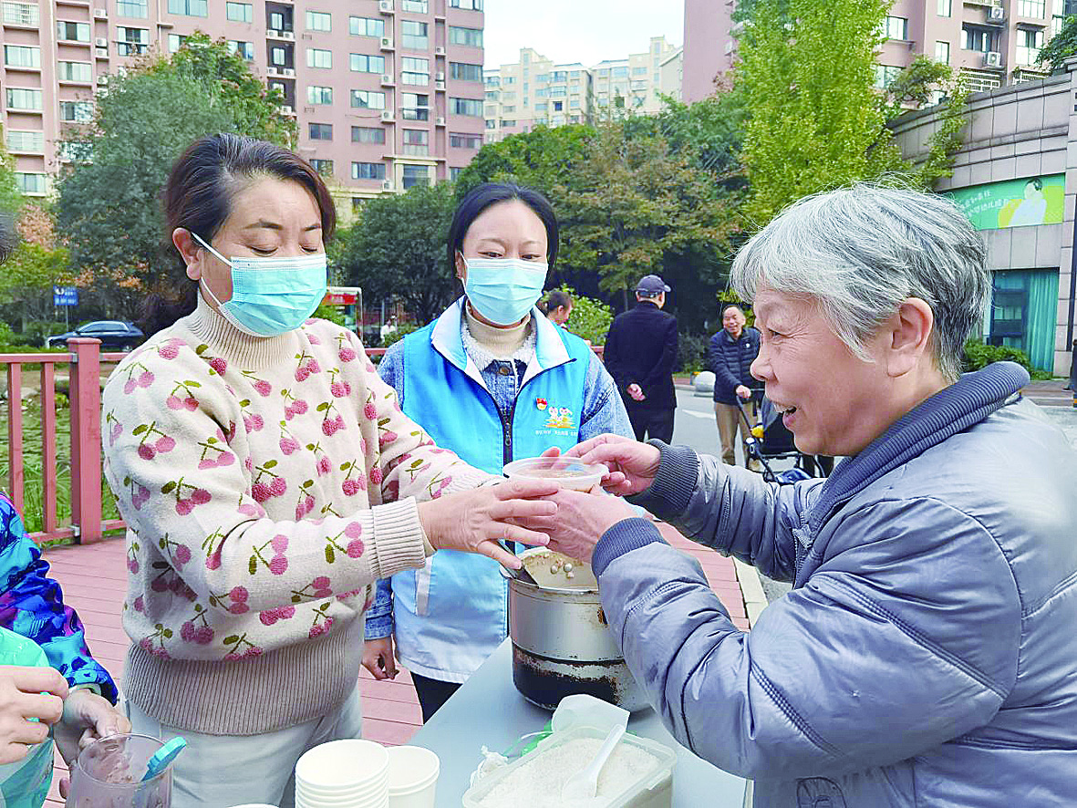 景园社区栗雨城颐景园小区内人头攒动,居民们都来领取百家粥。大米、绿豆、红豆、黑米、小米,丰富的食材由小区居民提供,经社区和物业人员熬煮,汇聚成一锅“爱心粥”。活动现场,还设有中医问诊、爱心义剪、牙科义诊、免费磨刀、清洗地毯、检修电器、消防安全知识竞答等活动。