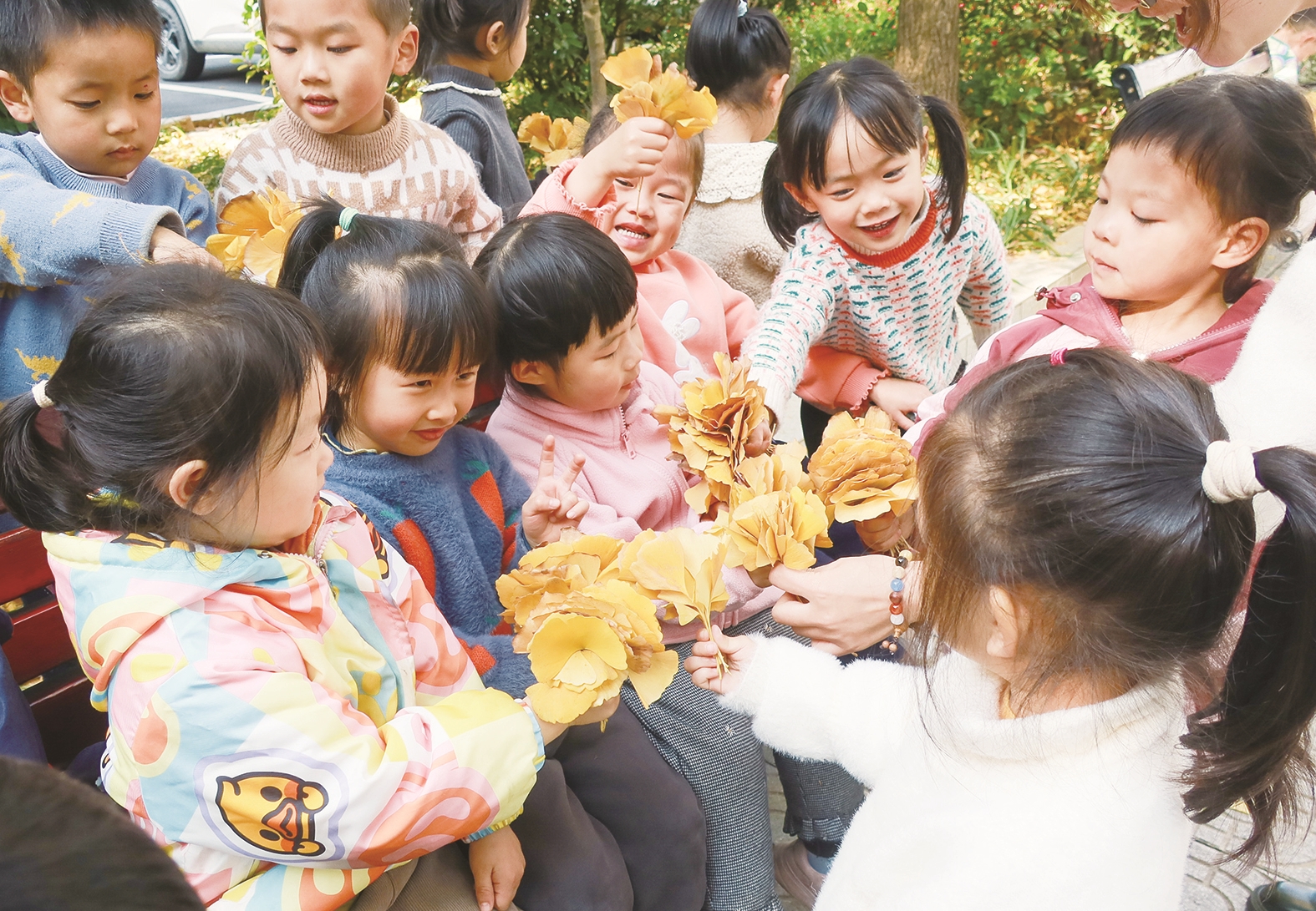 12月7日,农历大雪时节,我市城区冬日暖阳,温暖如煦。在天元区黄河北路,邮电源幼儿园中班的孩子们在老师的带领下观赏银杏落叶。
