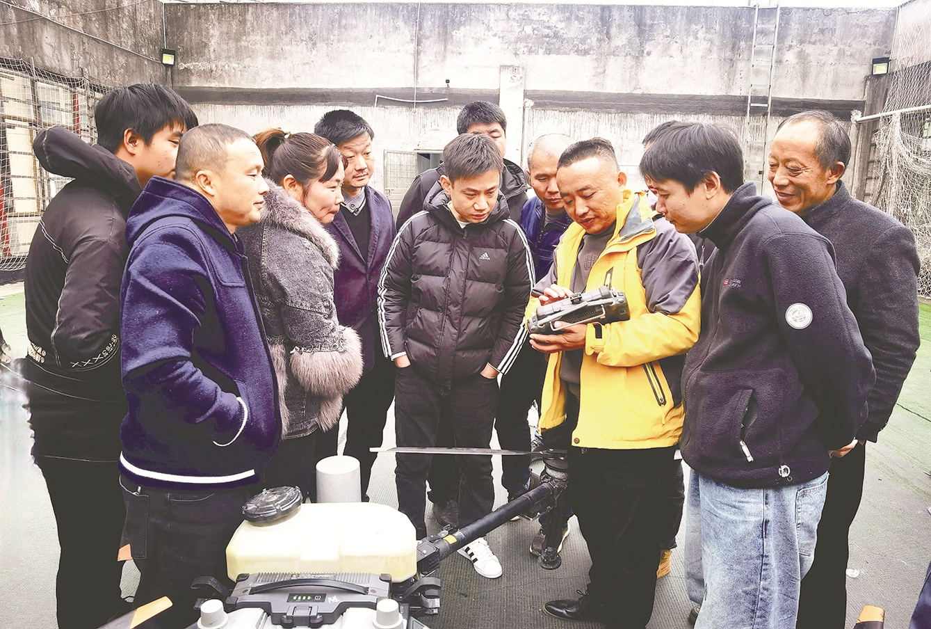 醴陵市颖斌农作物病虫害防治农民专业合作社已有6台农业无人机,其负责人介绍,明年计划再新增2台植保无人机,更好地服务醴陵现代农业发展。图为教员讲解植保无人机遥控器如何操作。