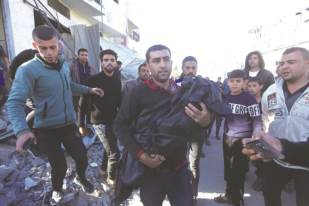 12月4日,在加沙地带南部城市拉法,一名男子抱着以军空袭遇难者的遗体。 新华社发(哈立德·奥马尔 摄)