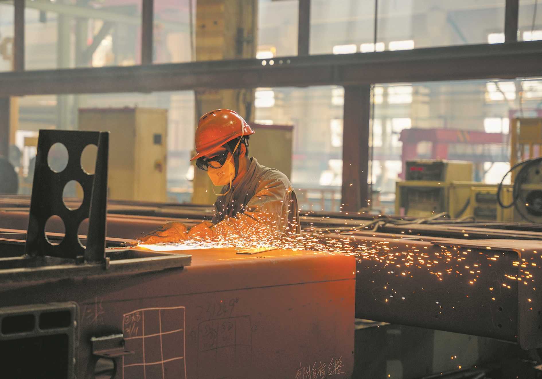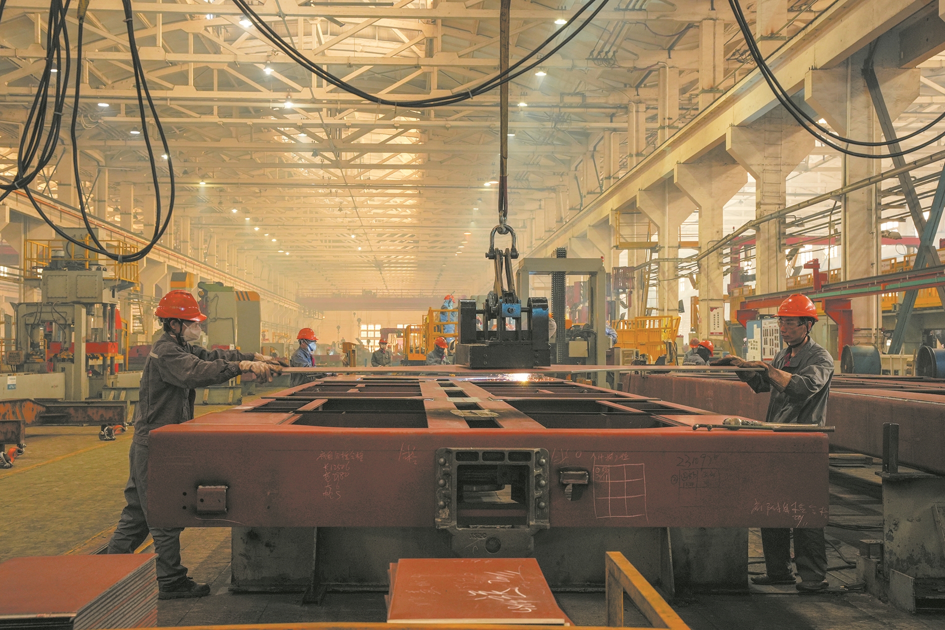 天车在空中穿梭,焊花熠熠,设备轰鸣,忙碌与火热的交织画面,犹如过年时的烟火广场。