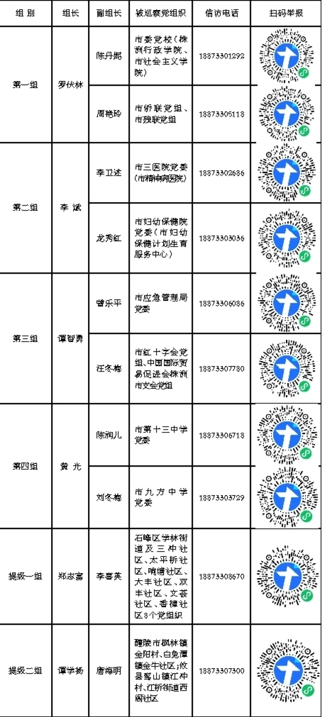巡察期间,各巡察组设专门值班电话、征求意见箱等,受理反映被巡察党组织领导班子及其成员、市委(县市区委)管理的其他干部及下一级主要负责人、重要岗位主要负责人等问题的来信来电来访,重点是关于违反政治纪律、组织纪律、廉洁纪律、群众纪律、工作纪律和生活纪律等方面的举报和反映。其他不属于巡察受理范围的信访问题,将按规定转交有关部门处理。现将各巡察组的值班电话(接听时间为:8:00—12:00,14:30—17:30),以及扫码举报“二维码”予以公布。