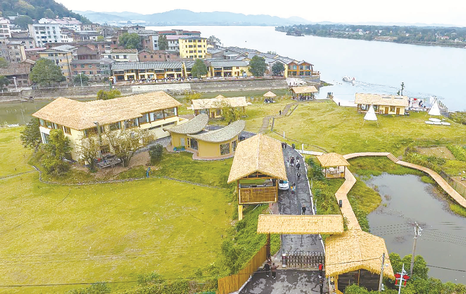 何处寻幽?笑抚江流,细掬斜阳。访老街故事,风敲铁马;果园试味,甜醉篮筐。芳径鸣虫,沙鸥唤客,浪影波光江景房。虽炎夏,赏水天夕彩,金碧辉煌。