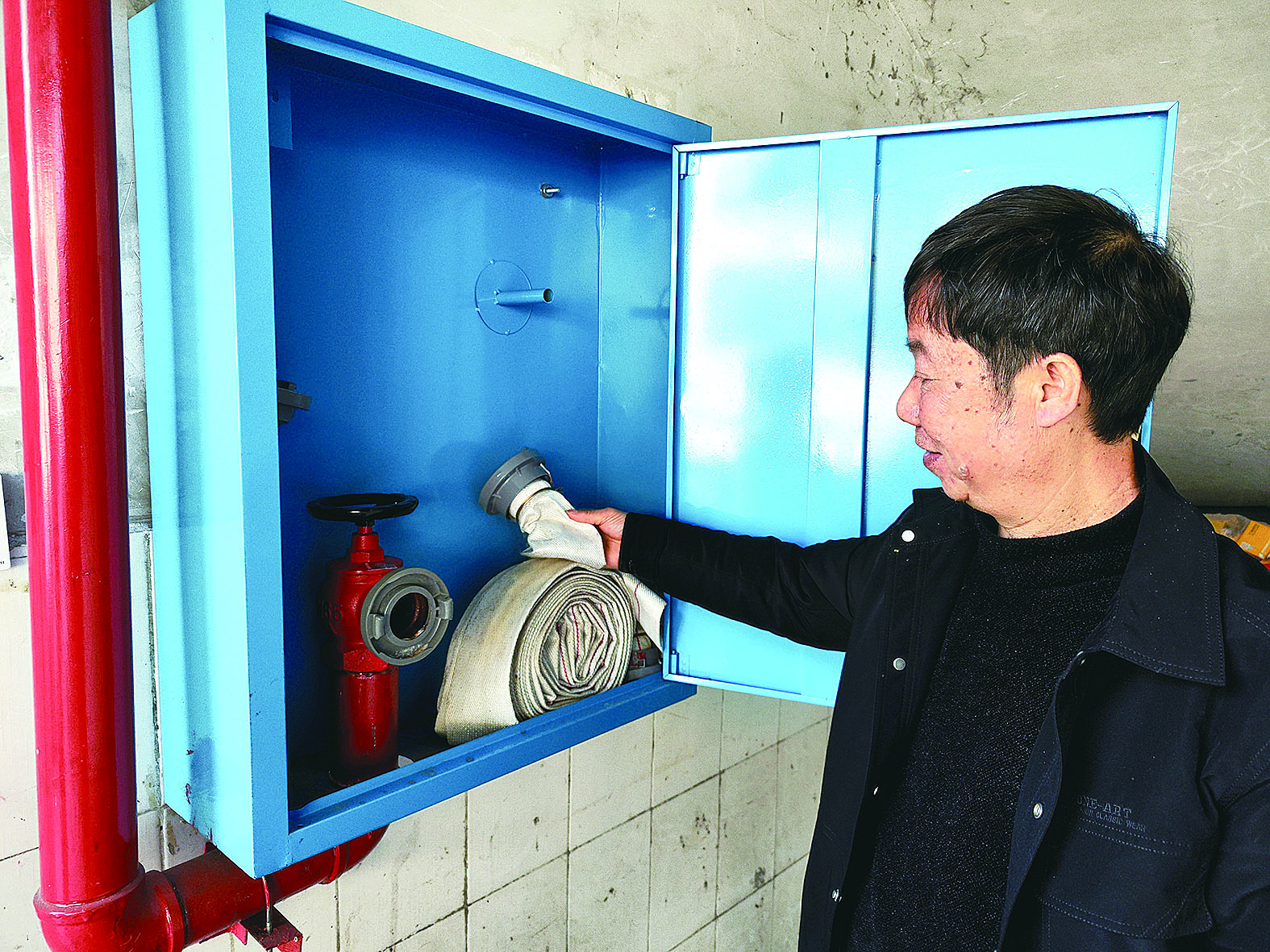 老胡向记者展示家里安装的消火栓等设施。 记者/杨凌凌 摄