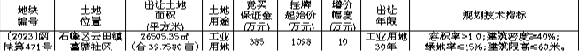 (三)出让起始价为1098万元,竞买保证金按出让起始价的35%确定为385万元,增加幅度为10万元。