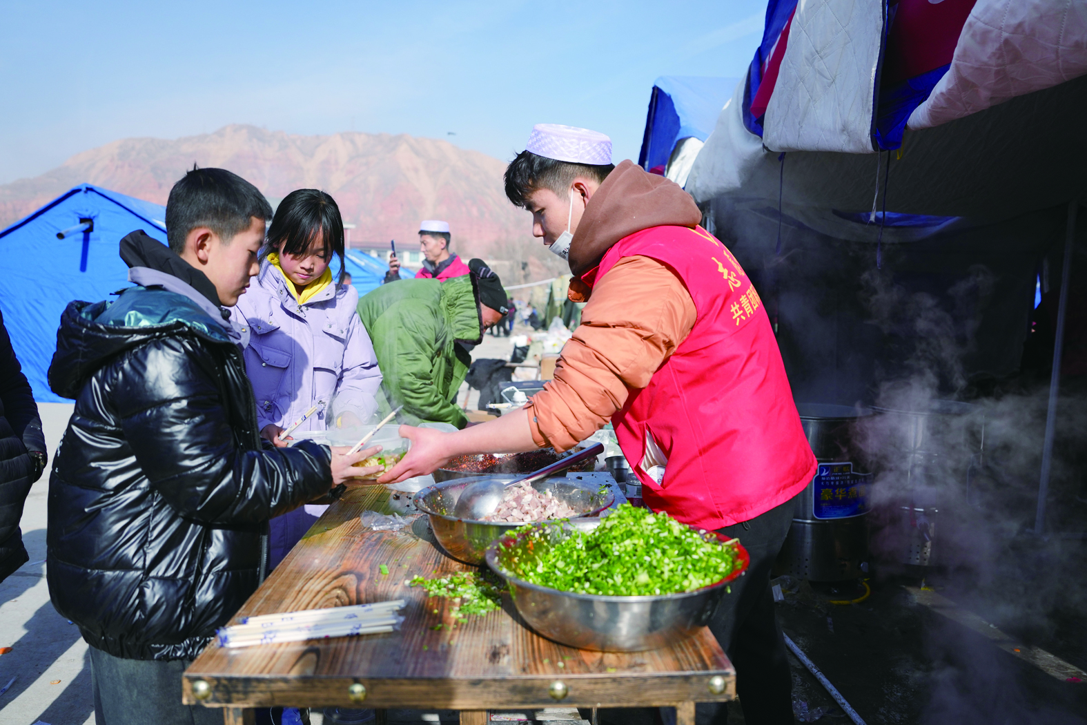 甘肃省临夏州积石山县6.2级地震发生后,当地紧急调拨救灾物资,协调救援保障力量,妥善安置受灾群众。在多方努力下,地震灾区各个临时安置点里的安置保障工作有条不紊展开,一顶顶帐篷成为受灾群众在寒冬里的“避风港”。条件虽然简陋,但大家有吃、有住、有医……帐篷里,受灾群众点燃火炉取暖;帐篷外,受灾群众排队领取热腾腾的免费牛肉面和各类应急物资。救援人员、医务人员、志愿者同受灾群众一道,相互帮助鼓励,将温情传递到安置点的每一个角落。