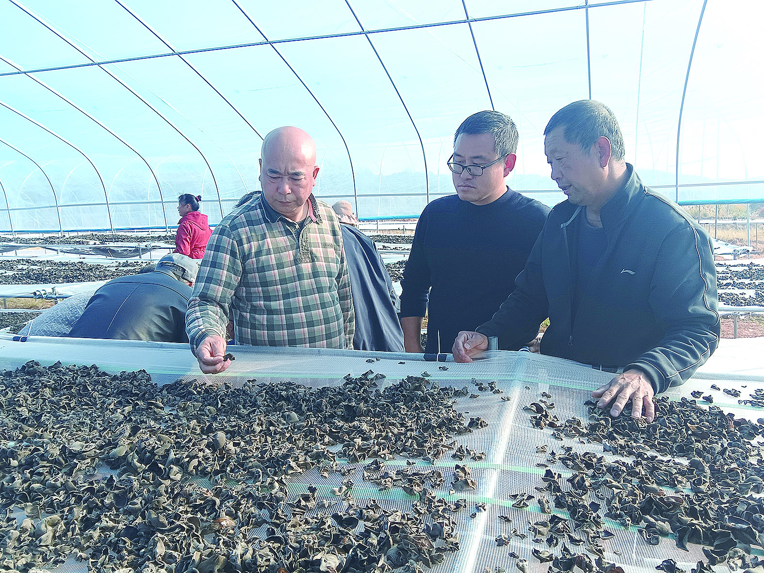 市派驻双江村工作队队长谢建文(左一),和种植户查看黑木耳晾干情况。 株洲日报全媒体记者/李军 摄