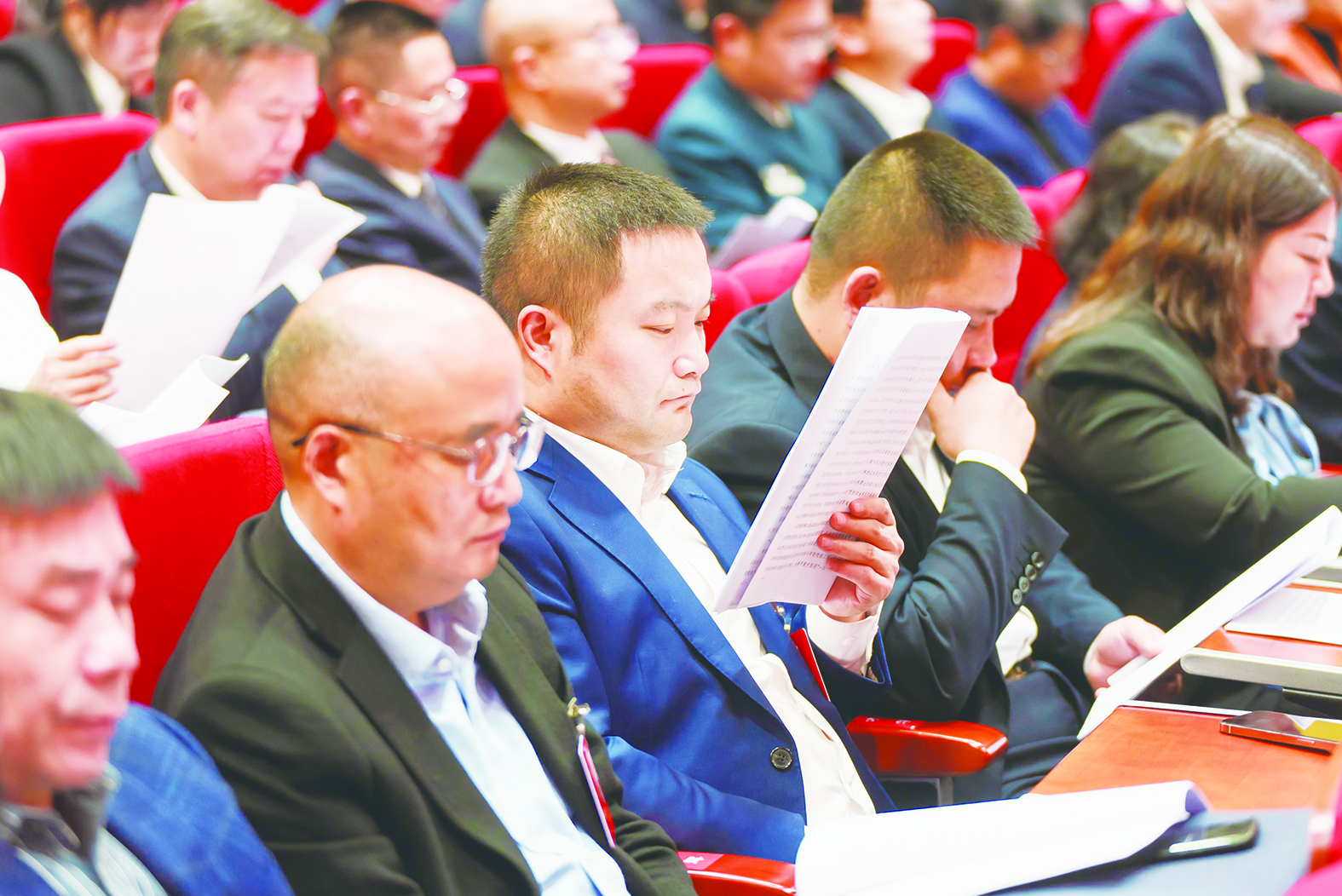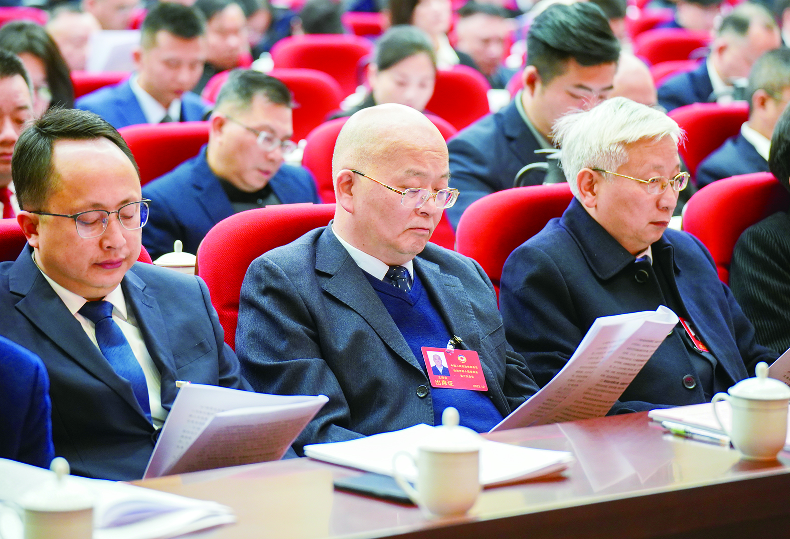 市政协委员认真聆听政协常委会工作报告。 记者/刘震 摄