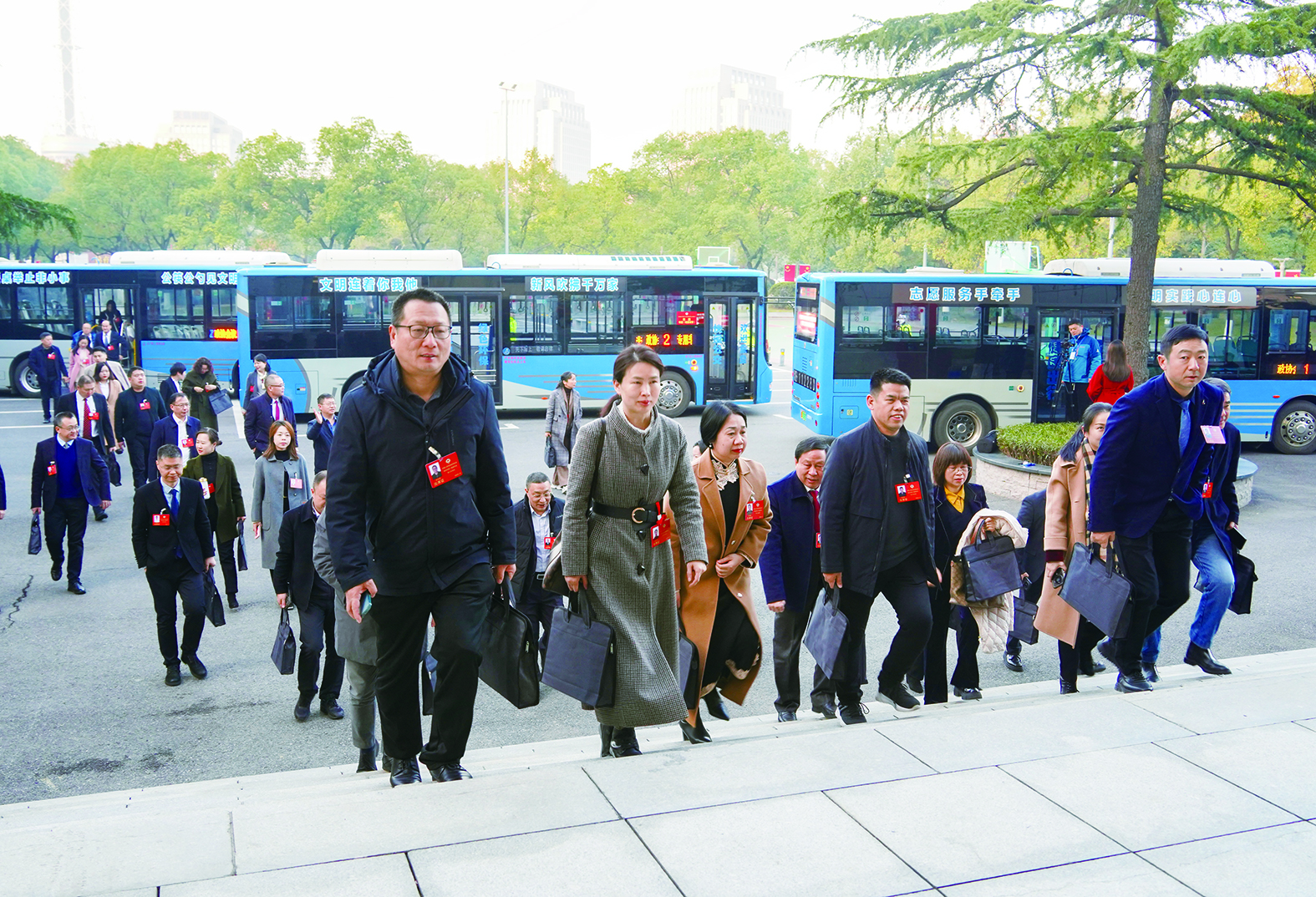市政协委员们乘坐株洲产的电动公交车赶赴会场。 记者/刘震 摄