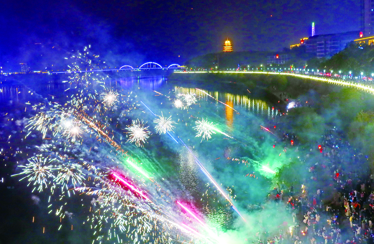2023年12月31日晚,在湘江株洲大桥段,市民们燃放焰火,迎接新年。 株洲日报全媒体记者/刘震 摄