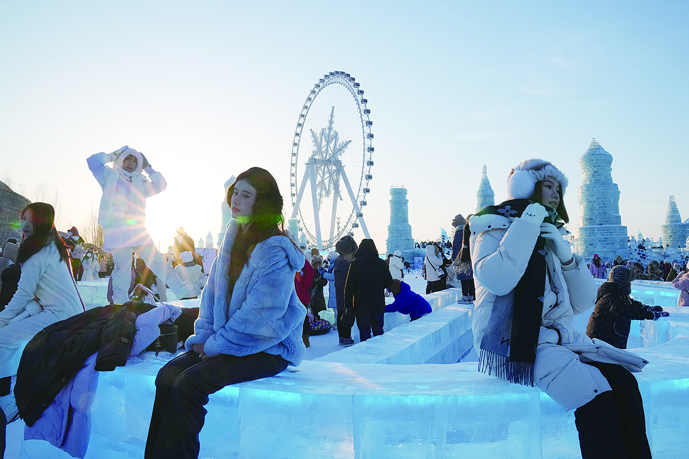 • 2023年12月31日,游客在哈尔滨冰雪大世界园区内游玩、拍照。