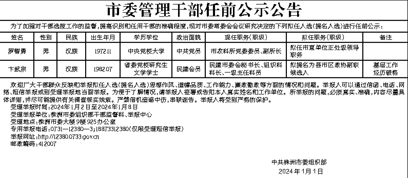市委管理干部任前公示公告