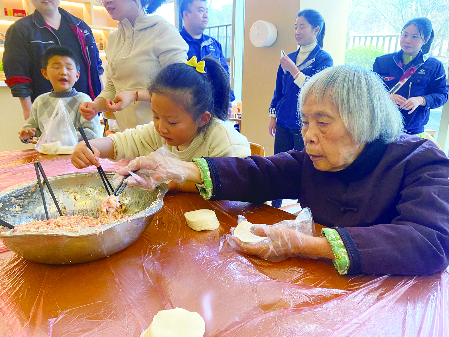 分好了肉馅、饺子皮,十余位老人围坐在2张桌子前,和站在身边的职工志愿者一起包饺子。85岁的陈奶奶手不是很稳,身边的志愿者就帮忙把馅放在老人手中的饺子皮里。不到十分钟,一个大铁盘里就盛满了5种样式的饺子。