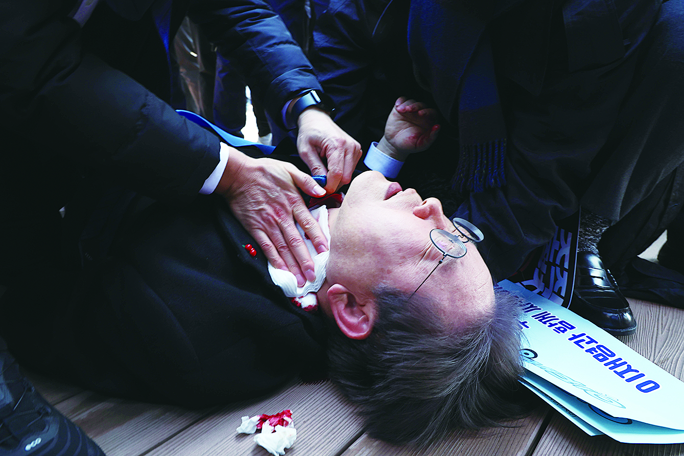 2024年1月2日,在韩国釜山,韩国最大在野党党首李在明遭袭倒地。 新华社/纽西斯通讯社