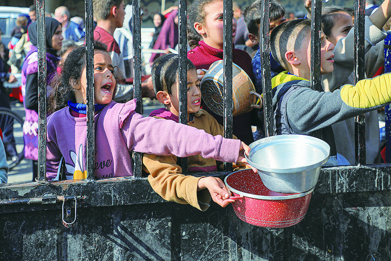 2023年12月31日,在加沙地带南部城市拉法,人们领取救济食物。 新华社发(里泽克·阿卜杜勒贾瓦德 摄)