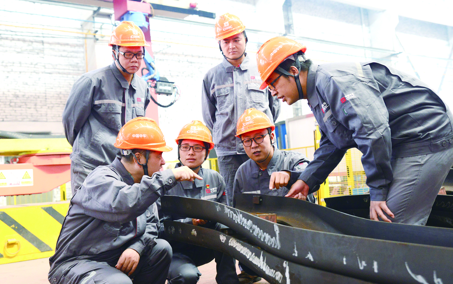 ◀大国工匠、全省首批特级技师易冉和同事探讨焊接技术。
