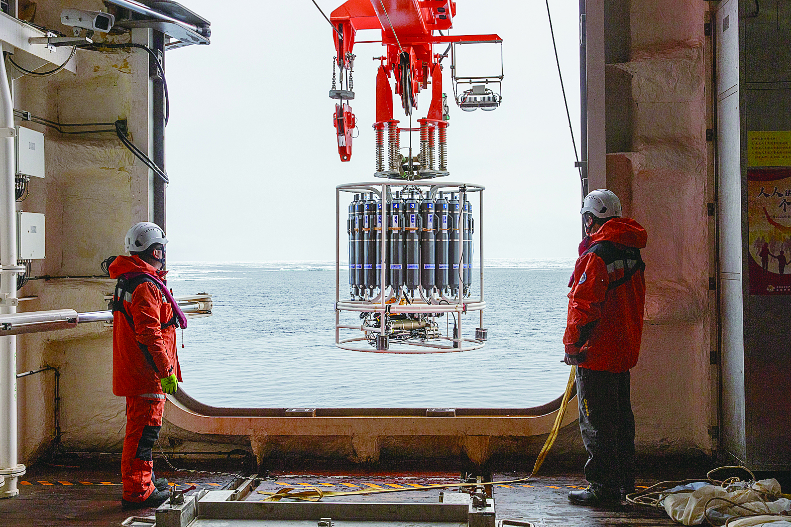 北京时间1月6日,“雪龙2”号月池车间,考察队员在回收CTD(温盐深剖面仪)。新华社发