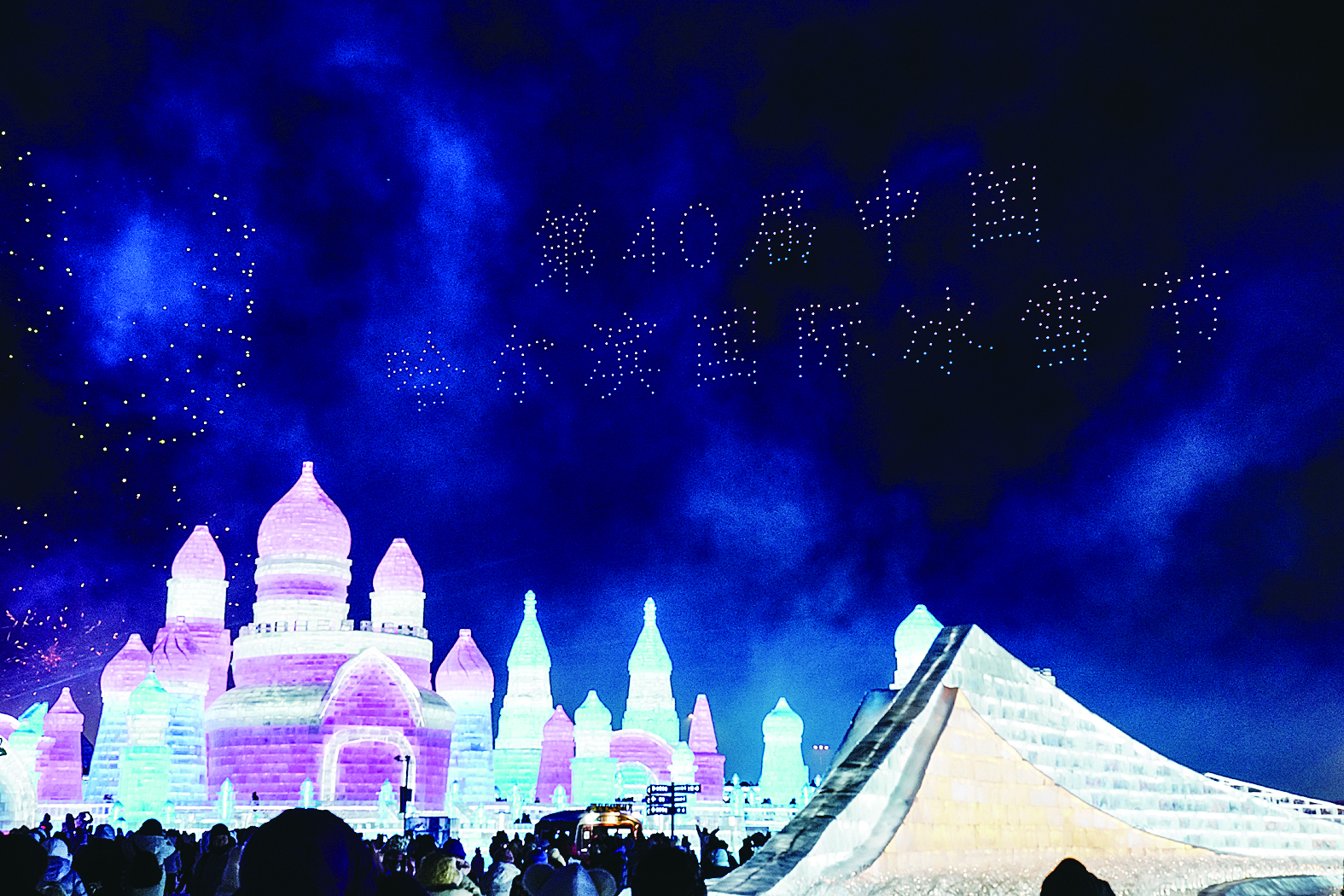 2024年1月5日,在哈尔滨冰雪大世界园区,游客观看哈尔滨国际冰雪节开幕式上的无人机表演。