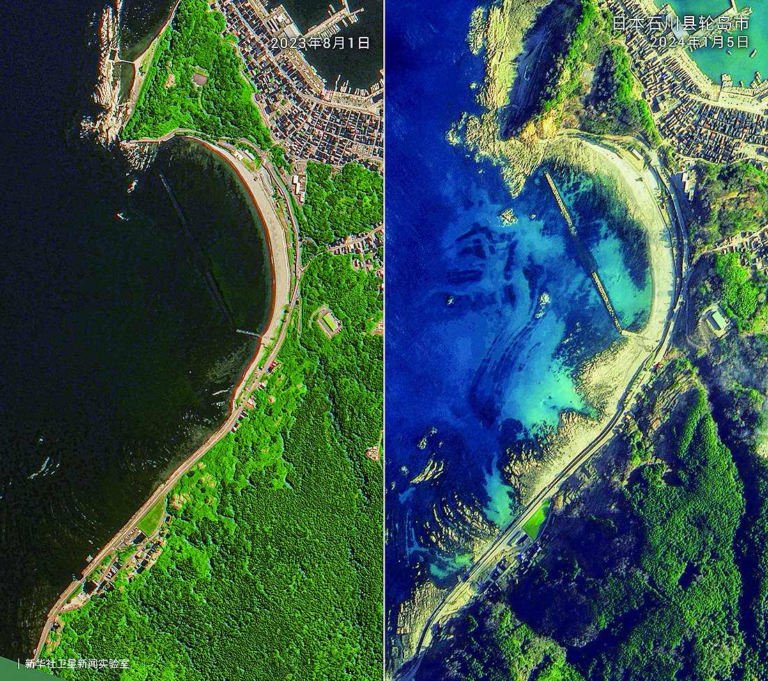 这张拼版照片显示的是2023年8月1日(左)和2024年1月5日日本轮岛市部分海岸线的卫星影像。 据日本《读卖新闻》报道,能登半岛地震后,日本国土交通省下属国土地理院研究人员分析卫星观测数据,发现从珠洲市经轮岛市至志贺町的沿岸海底隆起露出水面,总长度大约85公里。其中,轮岛市皆月湾一带海底隆起大约4米,海岸线向海中推进大约200米。 新华社发(新华社卫星新闻实验室 供图)