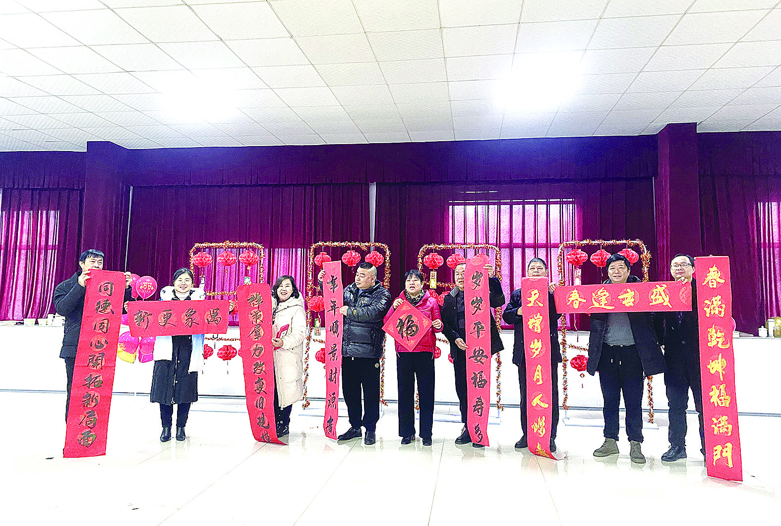 活动现场布置得喜庆而温馨,社区工作人员精心准备了琳琅满目的奖品。在“写春联,送春联”环节,书法爱好者张智勇铺好红纸,蘸好墨汁,挥洒着手中的毛笔,书写着一幅幅带有墨香和美好祝福的春联。很快,大红春联铺满现场,充满浓浓的年味。