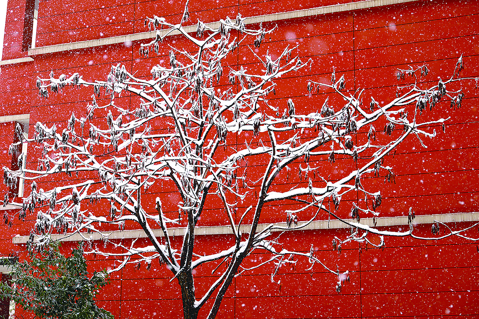 白雪覆盖的树木,与背后天元区菱溪中学的红墙相得益彰,煞是好看。 通讯员/雷良 摄