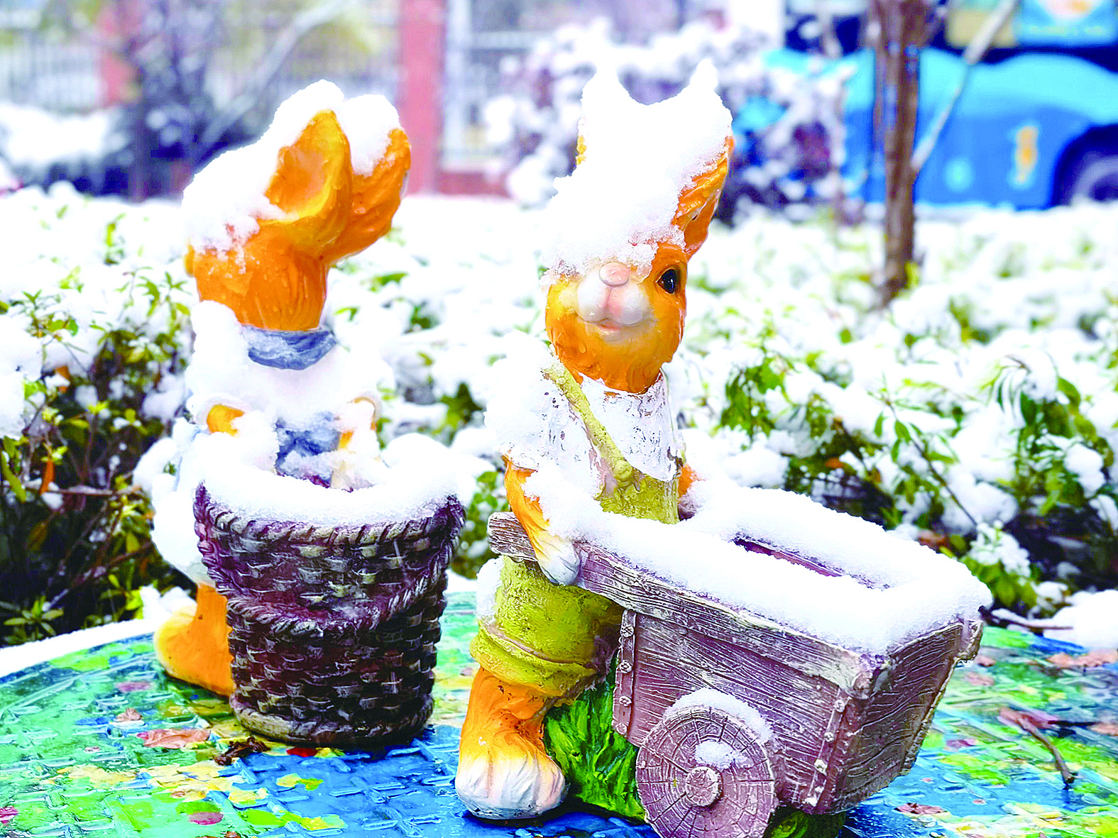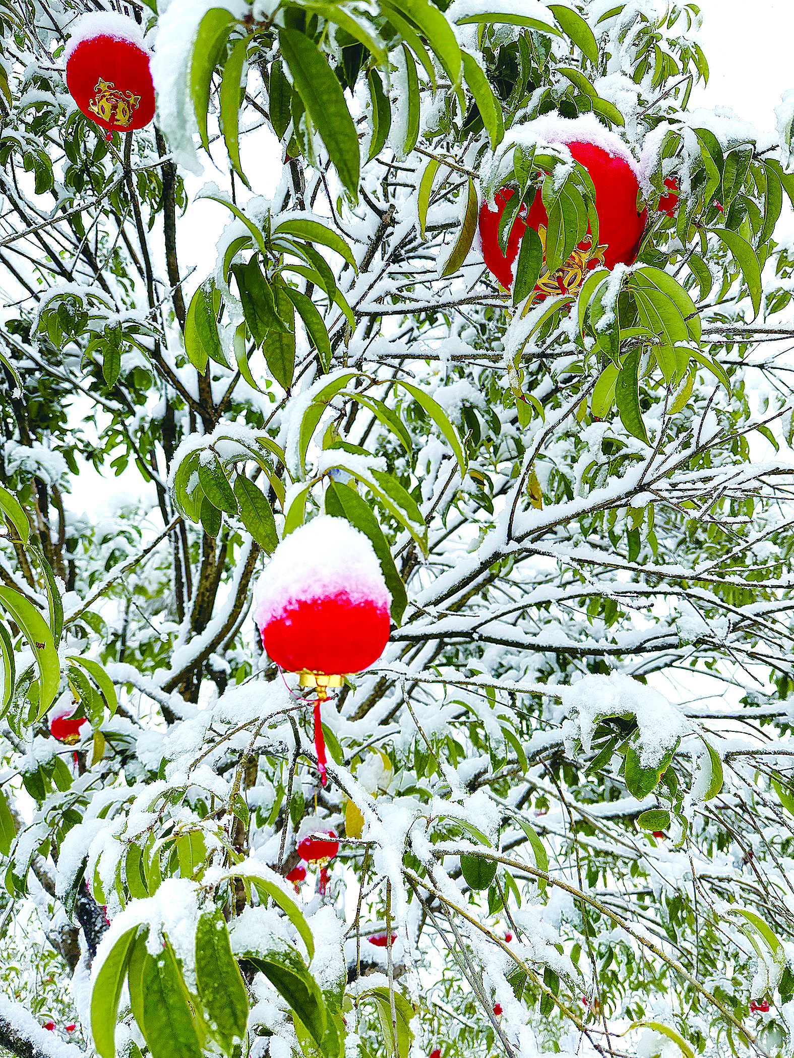 白雪覆盖在石峰区云龙香江学校内的红灯笼和绿叶上,平添几分雅致。 通讯员/陈佳妮 摄