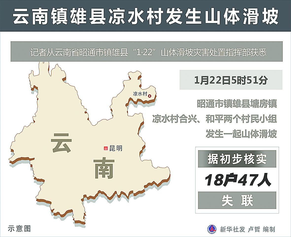 1月22日5时51分,云南昭通市镇雄县塘房镇凉水村合兴村民小组、和平村民小组发生山体滑坡,灾害造成18户、47人失联。截至当天19时,已搜救出8名被困者,均已无生命体征。