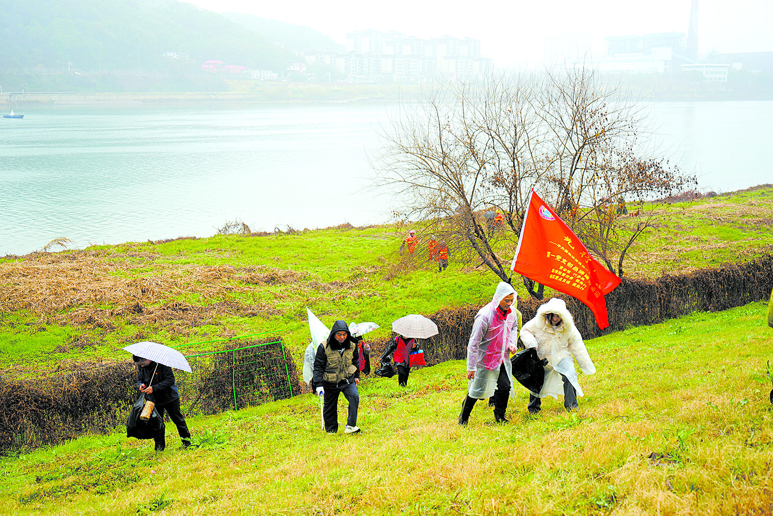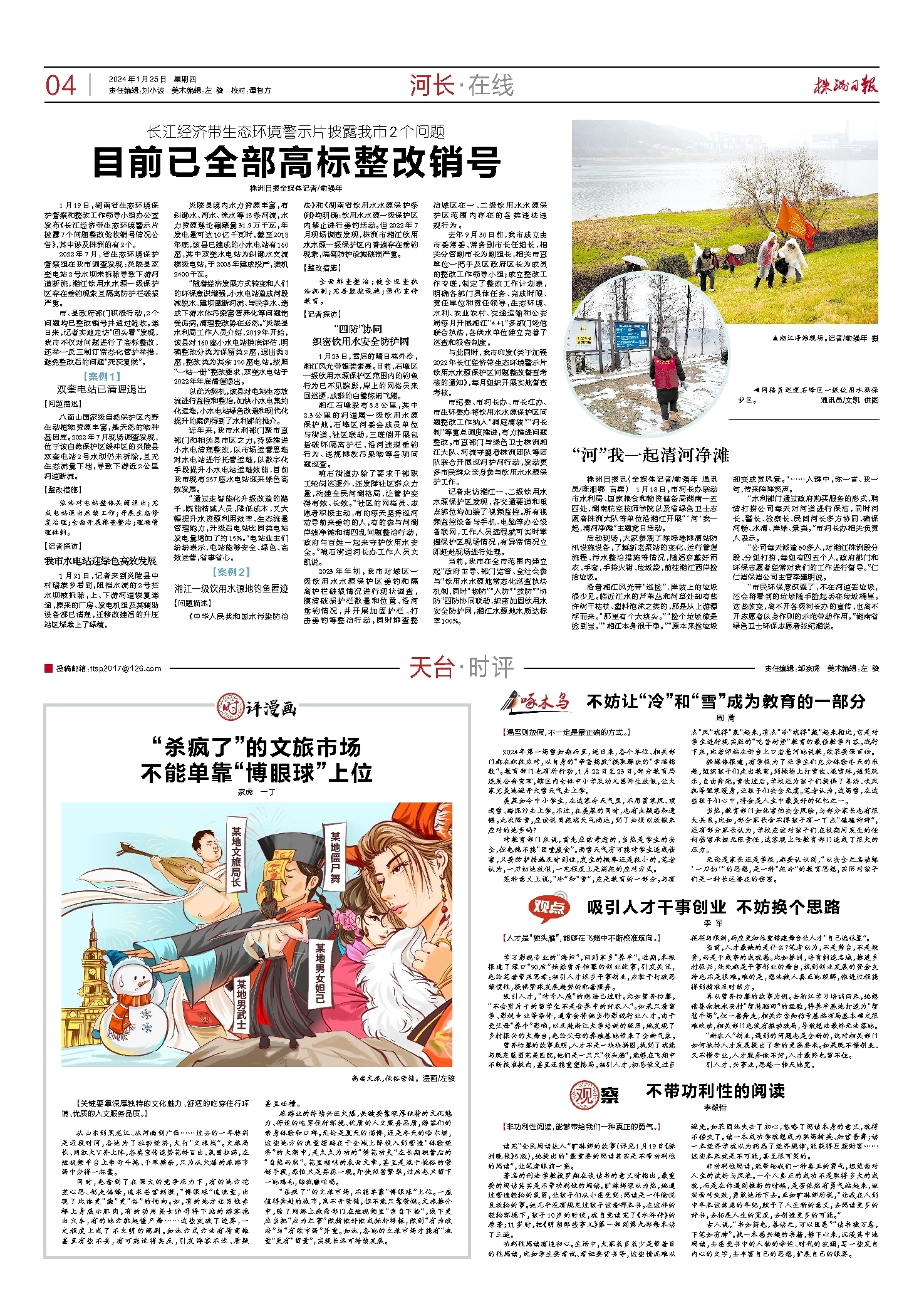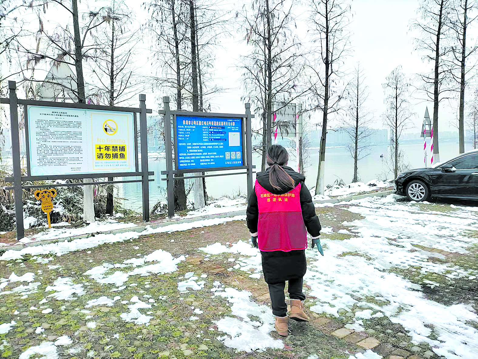 1月23日,雪后的晴日格外冷,湘江风光带银装素裹。目前,石峰区一级饮用水源保护区范围内的钓鱼行为已不见踪影,岸上的网格员来回巡逻,成群的白鹭悠闲飞翔。
