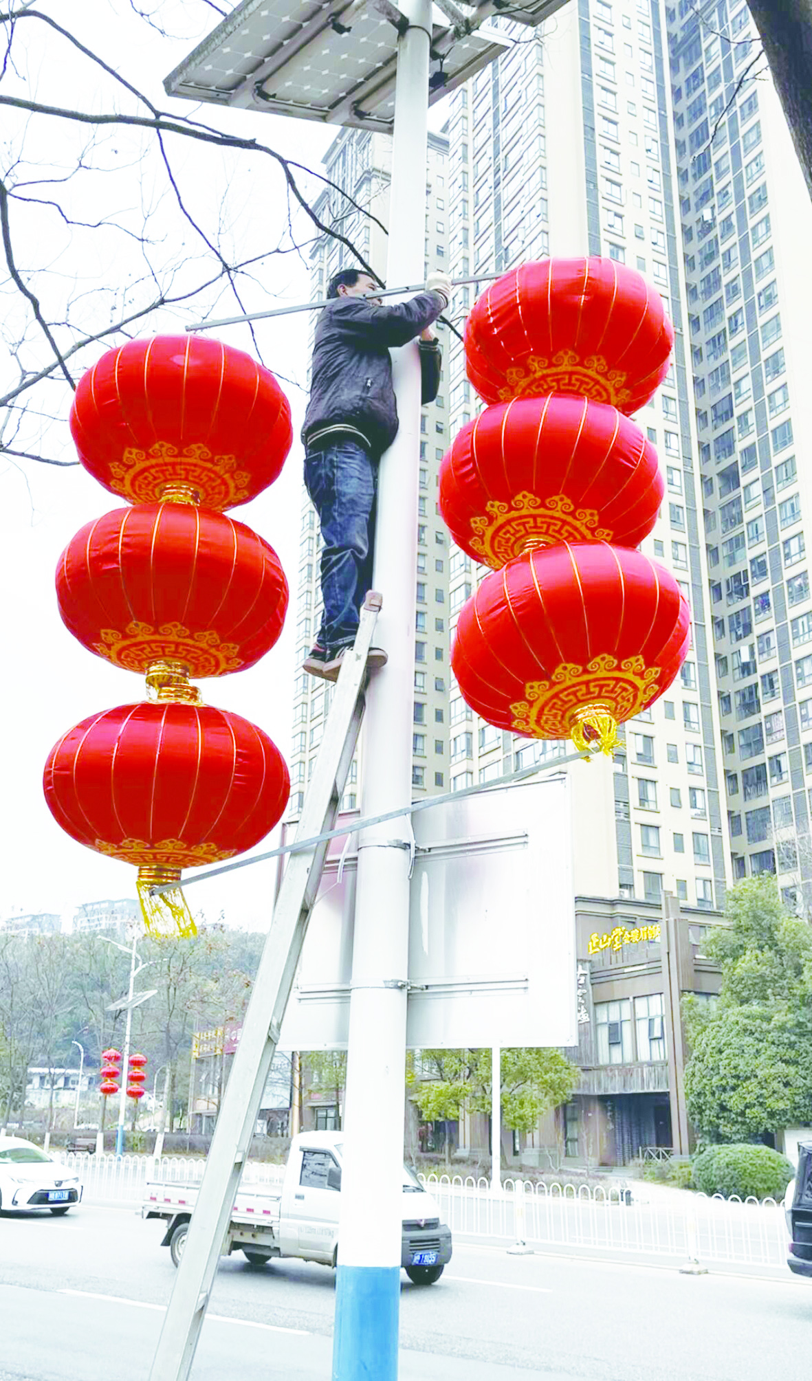 1月26日,天元区黄河北路,安装人员在路边悬挂大红灯笼,营造喜庆祥和、红红火火的节日氛围。 株洲日报全媒体记者/刘平 摄