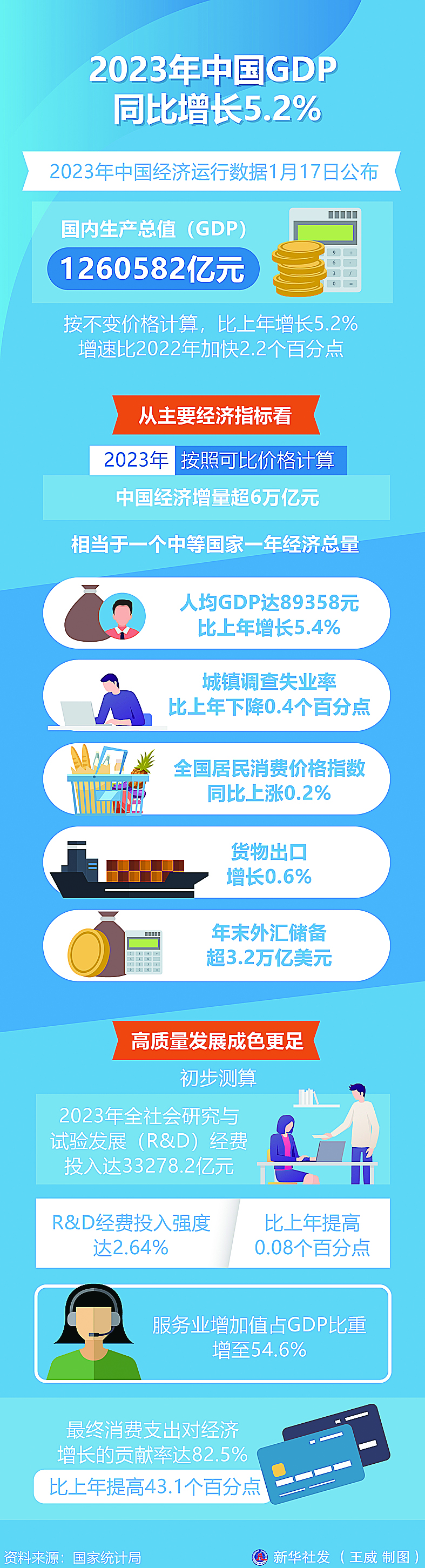 据官方数据,初步核算,2023年中国国内生产总值(GDP)超126万亿元(人民币,下同),按不变价格计算,比上年增长5.2%。这个数字不仅高于全球3%左右的预计增速,在世界主要经济体中也名列前茅。