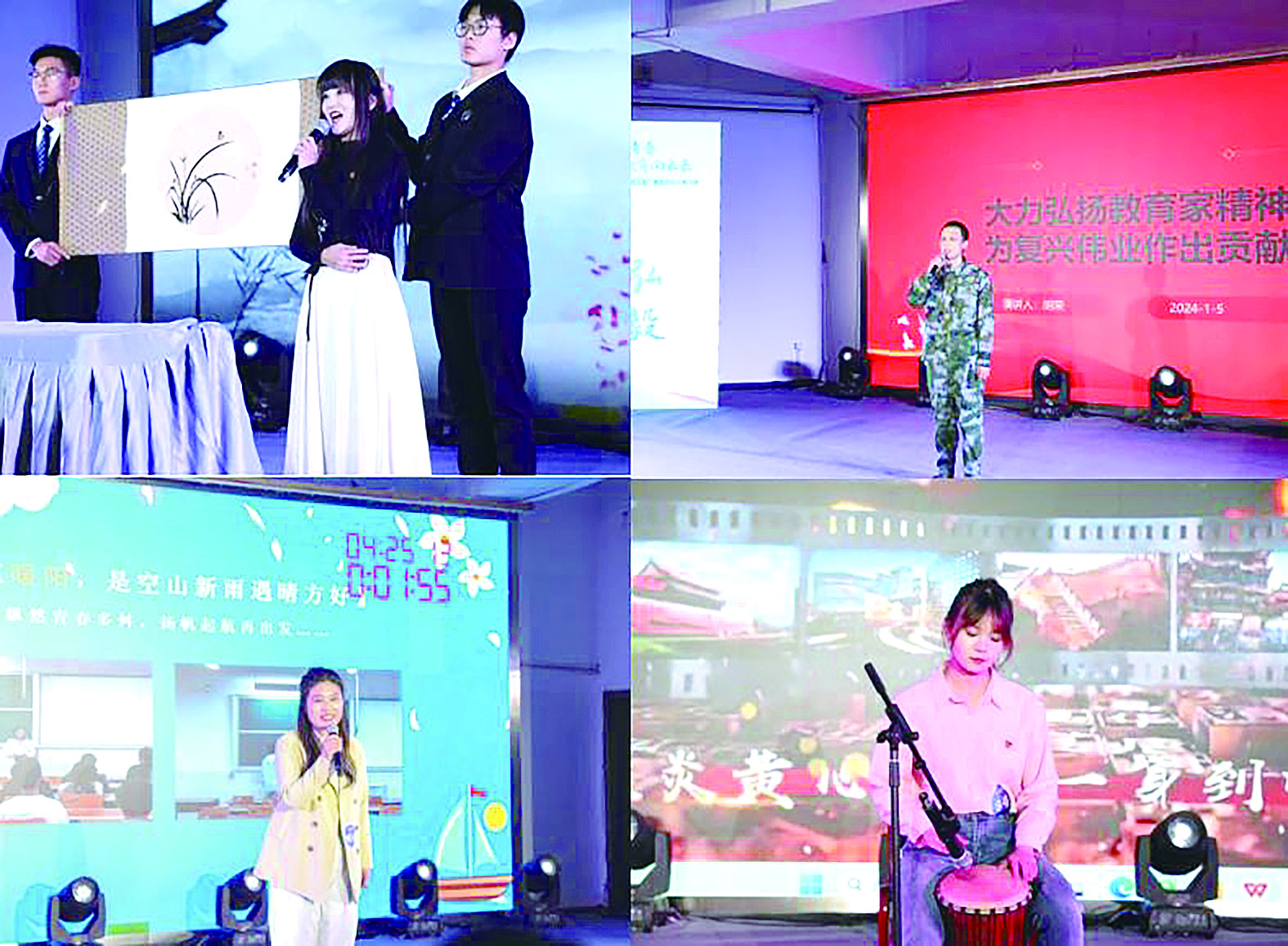 决赛环节“综合能力评比”共分为主题演讲、评委提问、才艺展示三个部分。参赛的青年教职工在主题演讲环节围绕党和国家的教育事业,以“教育家精神”为主题,从“心有大我、志诚报国”的理想信念出发,分享自身“启智润心、因材施教”的育学方法。