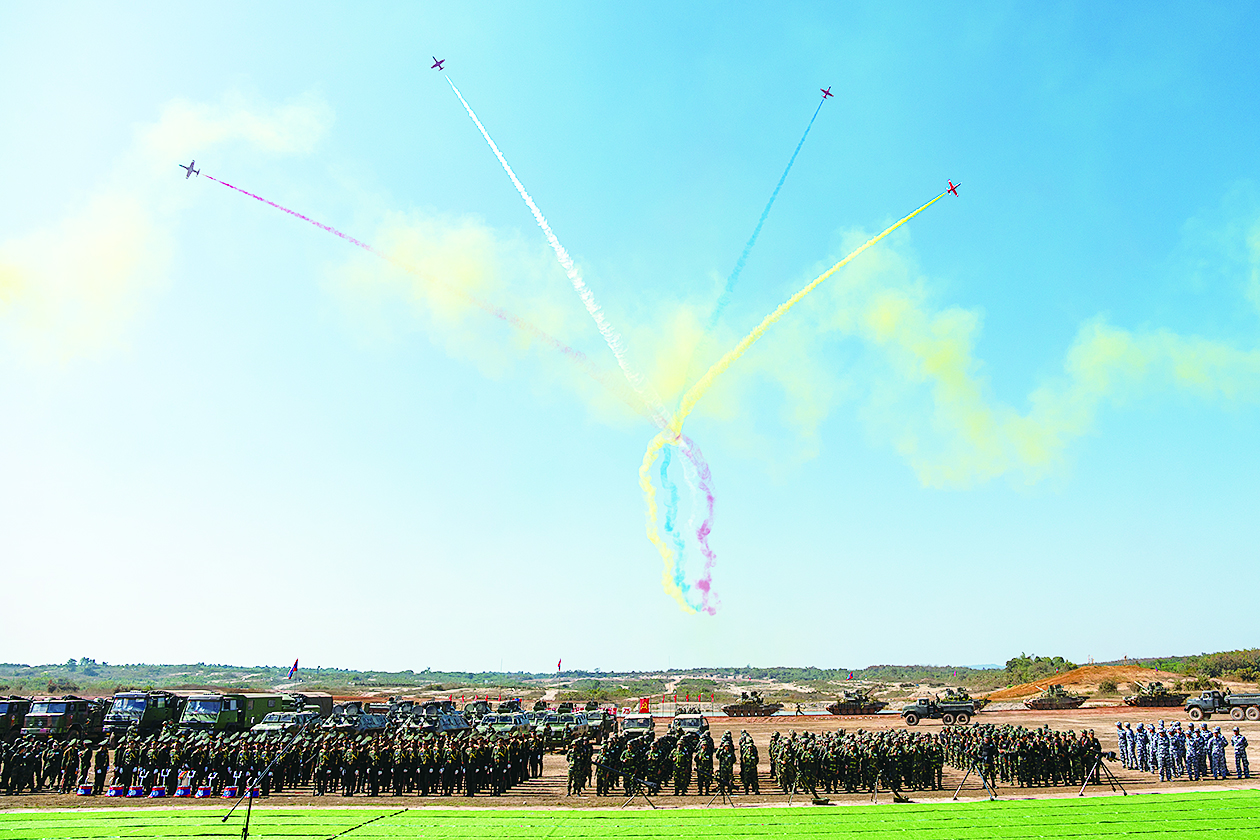 1月17日,中国空军“红鹰”飞行表演队在老挝万象库玛丹军事学院训练场进行飞行表演。 中国空军“红鹰”飞行表演队9架教-8表演机1月13日上午由西南某机场出境飞赴老挝,应邀参加老挝人民军建军75周年庆祝活动。1月17日,“红鹰”飞行表演队在老挝万象库玛丹军事学院训练场进行飞行表演。这是中国空军飞行表演队首次赴老挝飞行表演,也是“红鹰”飞行表演队首次出国飞行表演。 新华社发(凯乔摄)