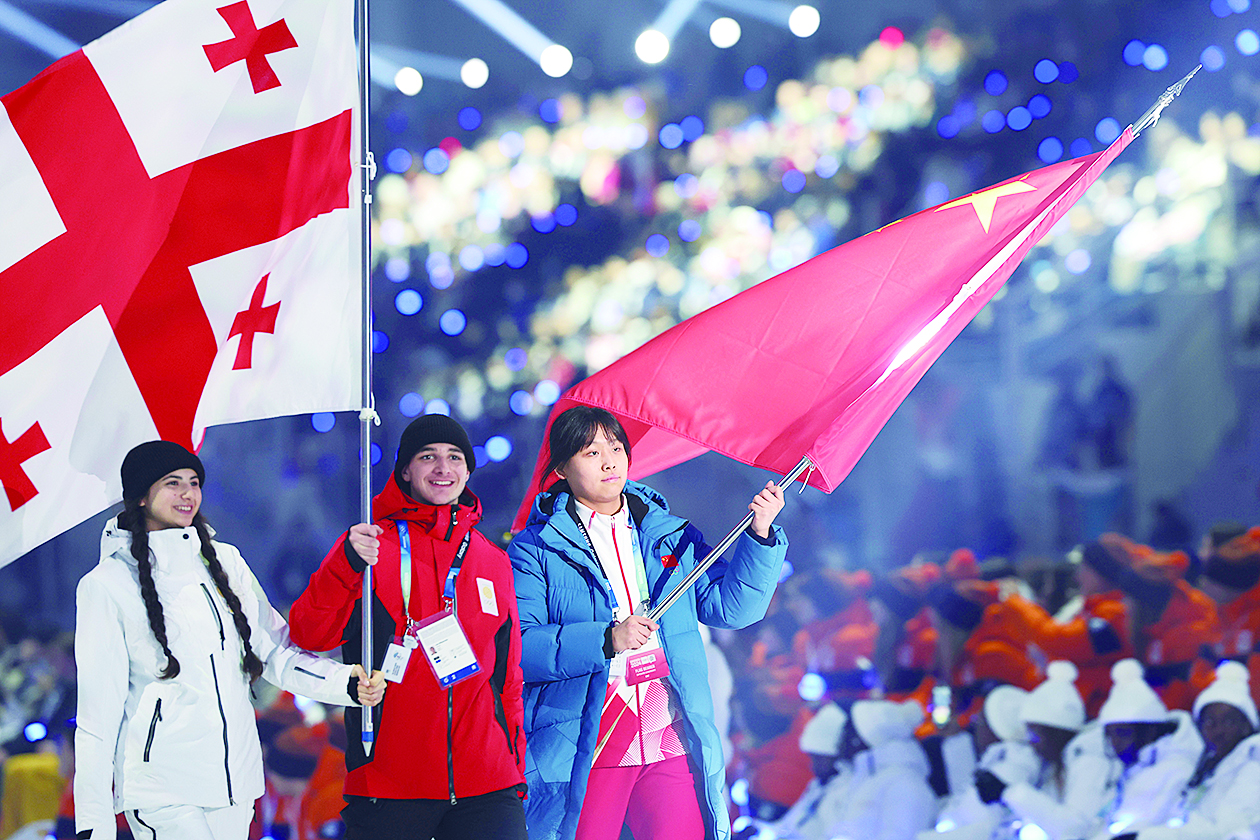 1月19日,中国代表团旗手、女子冰球运动员张菁月(右)在江陵速滑馆举行的开幕式上手执国旗入场。 新华社记者 姚琪琳 摄