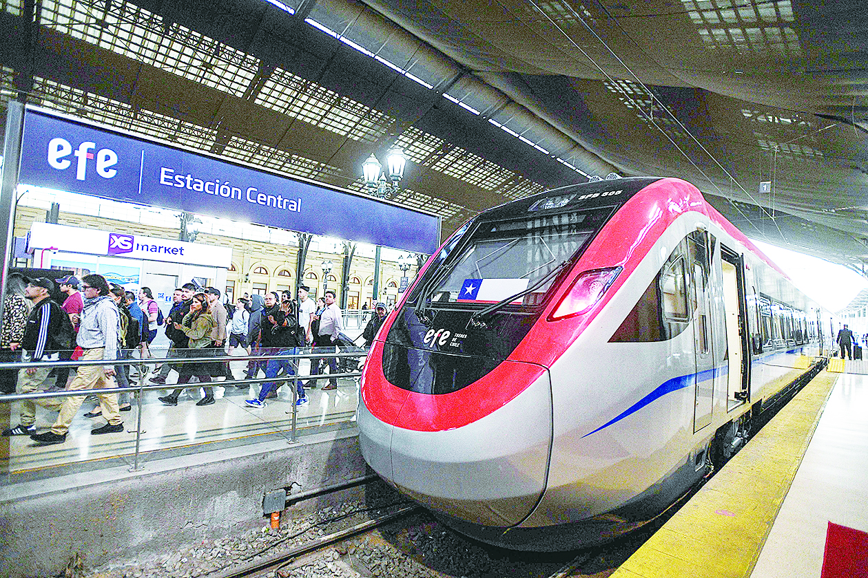 1月19日,在智利圣地亚哥中央车站,中车四方研制的电力内燃双动力动车组等待发车。 新华社发(豪尔赫·比列加斯 摄)