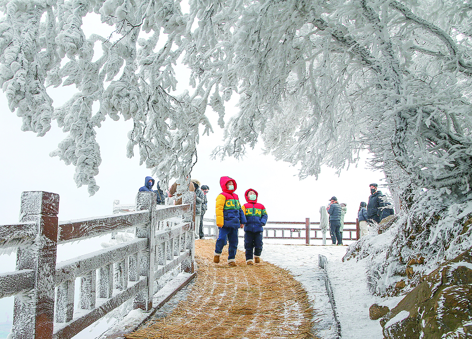 1月21日,游人在江苏连云港市海上云台山景区观赏雾凇、雪凇叠加景色。新华社发