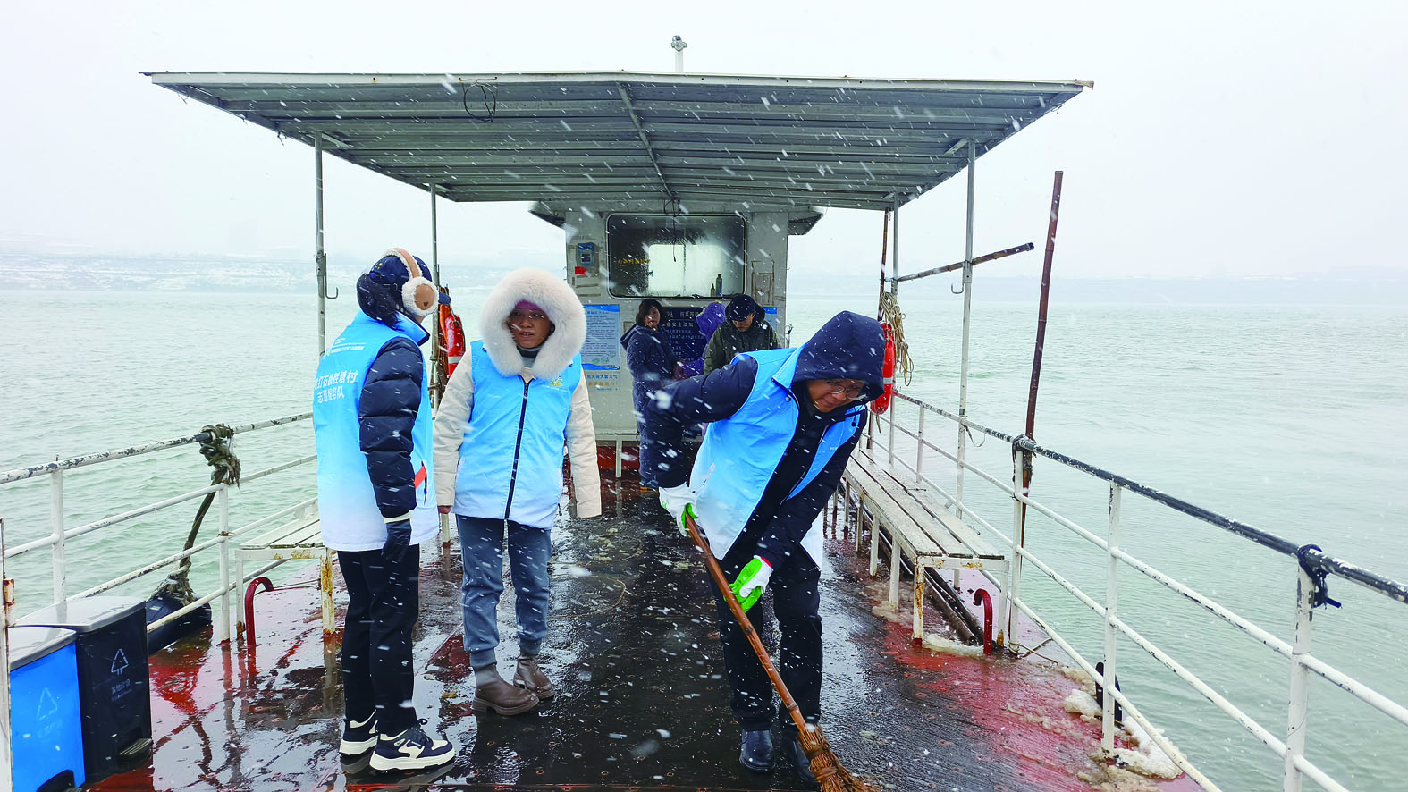 雷打石镇胜塘村工作人员及时清理通往渌口区的白沙洲渡口渡船上的积雪,保障渡口交通通行安全。 记者/杨如 摄