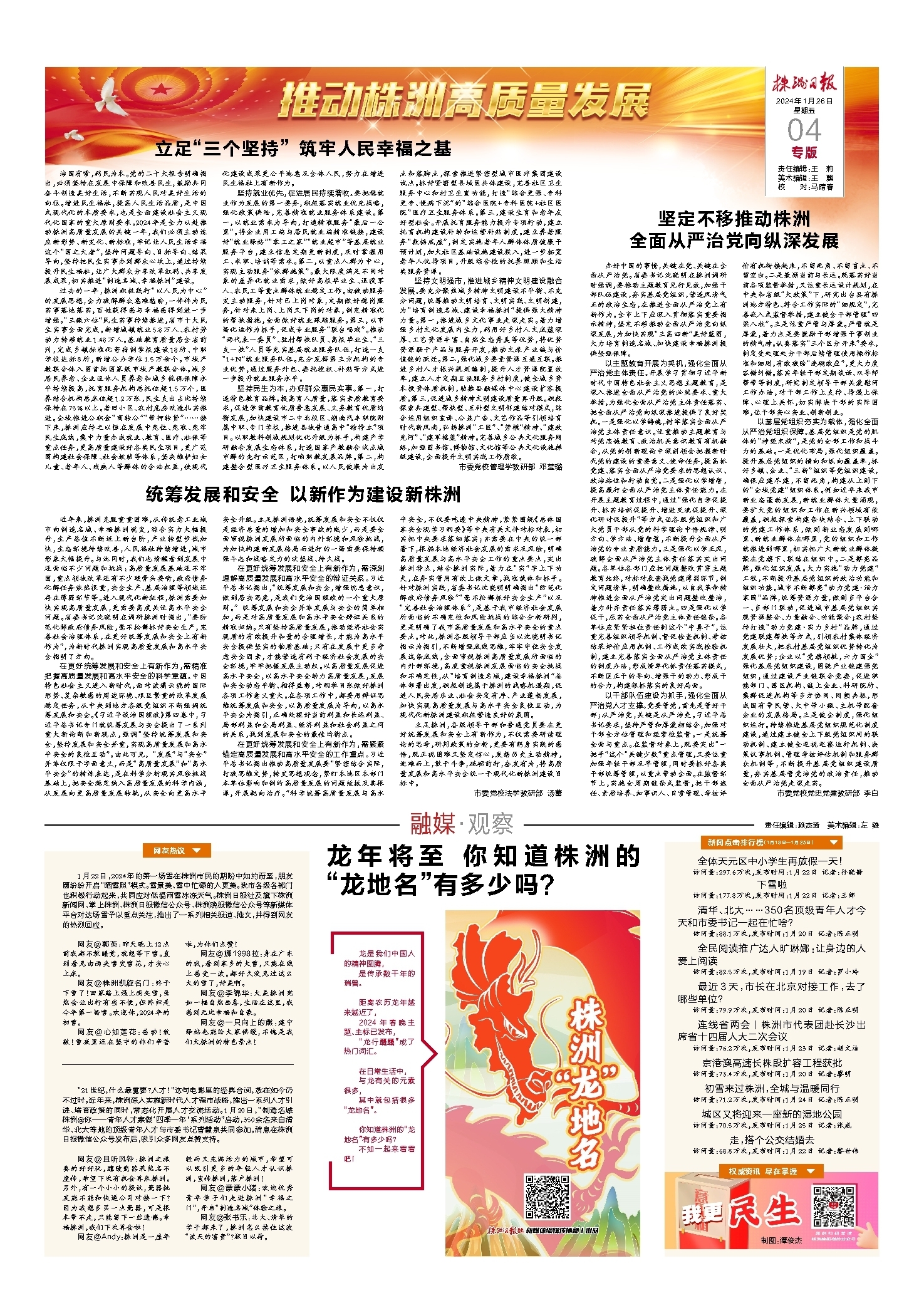 治国有常,利民为本。党的二十大报告明确指出,必须坚持在发展中保障和改善民生,鼓励共同奋斗创造美好生活,不断实现人民对美好生活的向往。增进民生福祉,提高人民生活品质,是中国式现代化的本质要求,也是全面建设社会主义现代化国家的重大原则要求。2024年是全力以赴推动株洲高质量发展的关键一年,我们必须主动适应新形势、新变化、新标准,牢记让人民生活幸福这个“国之大者”,坚持问题导向、目标导向、结果导向,坚持把民生实事办到群众心坎上,通过持续提升民生福祉,让广大群众分享改革红利、共享发展成果,切实推进“制造名城、幸福株洲”建设。