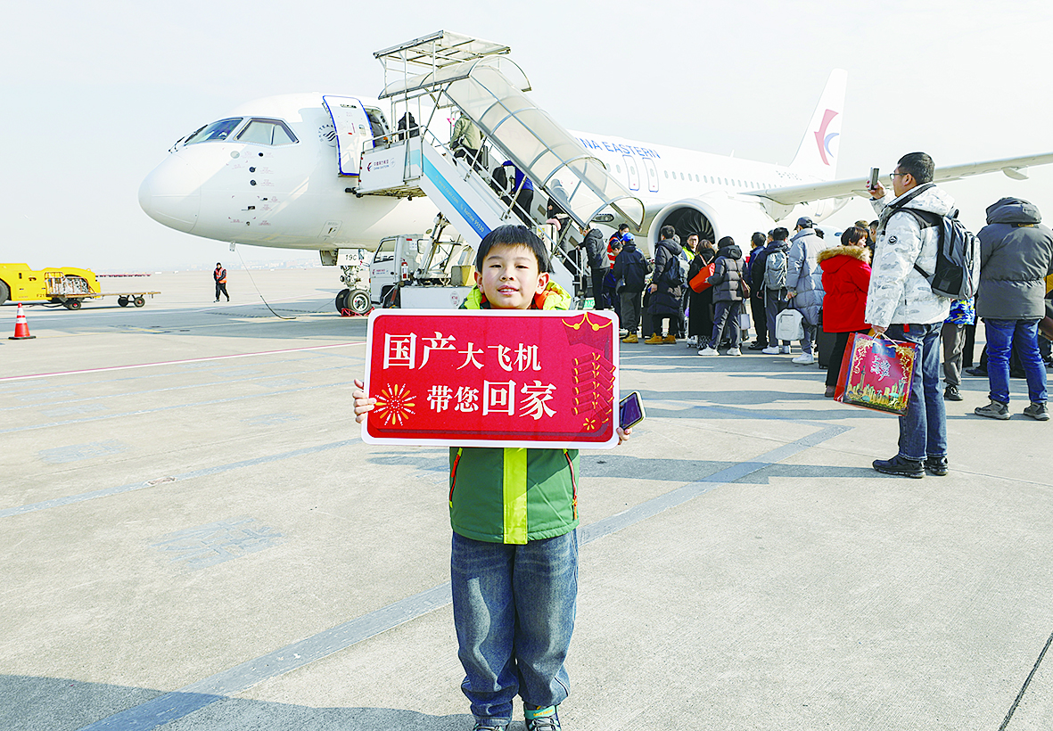 26日,在上海虹桥机场,一位小旅客手举标语牌在国产大型客机C919前合影。 新华社发