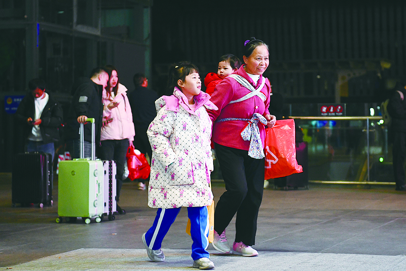 1月26日,一位老人带着孩子在深圳北站进站乘车。 新华社记者 梁旭 摄