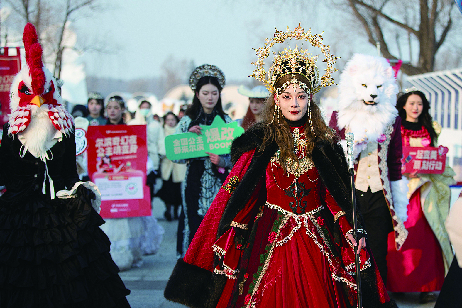 1月28日,在哈尔滨太阳岛雪博会园区内,演职人员盛装巡游,与游客亲切互动,成为“雪世界”的一道浪漫风景。 新华社记者 张涛 摄
