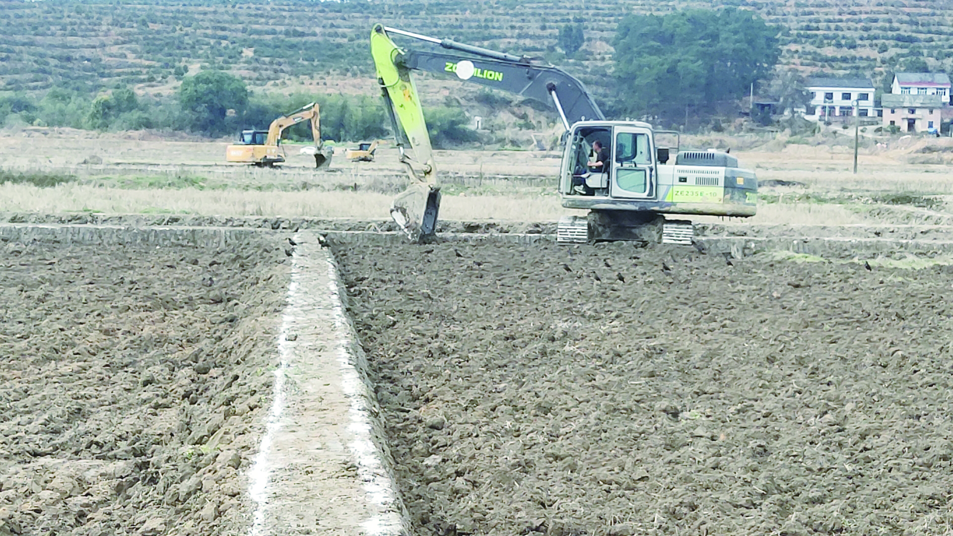 在玳溪村高标准农田建设项目现场,机声隆隆,两台挖掘机来回穿梭。20多位村民扛着锄头、铲子埋头苦干,平田整地、开挖沟渠、整修田埂,“田成方、路相通、渠相连、涝能排、旱能灌”的高标准农田建设格局正逐步形成。