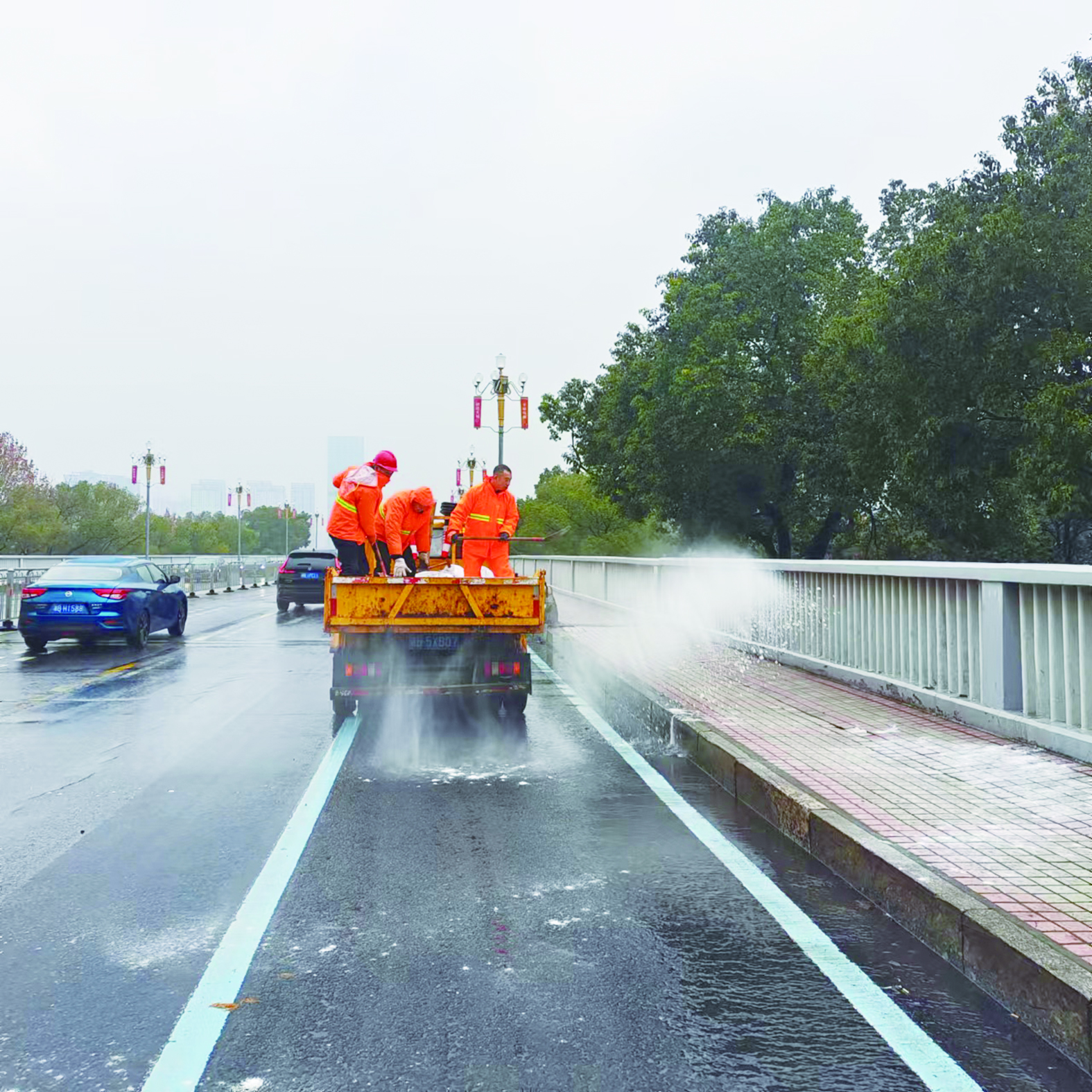 冻雨天气来临,全市城管系统已启动应急预案,安排专人赶赴城区主要路段值守巡查,持续落实“一桥一专班”举措,做好跨江大桥防冰冻保障;园林、环卫部门做好树木枯枝的巡查和清理工作,保障市民度过一个安全祥和春节假期。图为市政工程维护中心应急队员昨天提前在芦淞大桥、株洲大桥等跨江桥梁沿线撒布融雪剂,预防道路结冰。 株洲日报全媒体记者/伍靖雯 摄