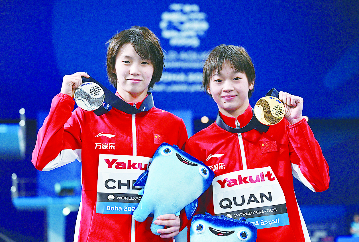 图为2月5日,冠军中国选手全红婵(右)与亚军中国选手陈芋汐在颁奖仪式后合影。 新华社记者 夏一方 摄