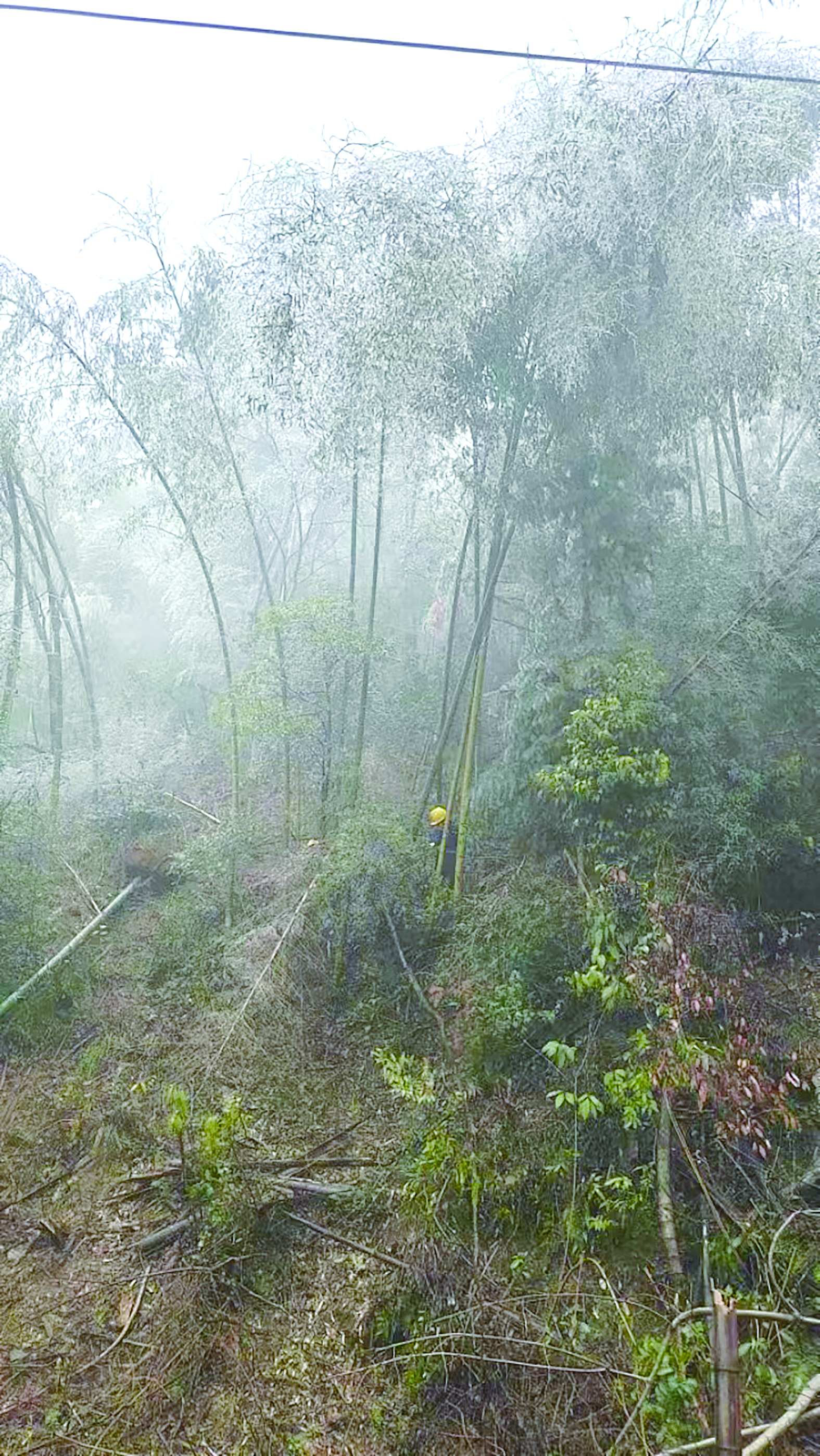 “战士们”到了山区,湿滑的路面车辆无法行走,大家只能下车冒雨徒步上山,山道两旁的树竹,被覆冰压弯,挡了队员们的去路,冰封后的山路比以往更难辨别方向,经验丰富的朱辉江早已对这些线路烂熟于心,为了尽快赶到目的地,他冲锋在前,拿起木棍敲打冰层,用工具开辟出一条小路,大风裹挟着冻雨,如刀割般划拉着他的脸颊,低温早已将他的脸和手冻得通红,工装帽子里也早已盛满了随时掉落的冰块。