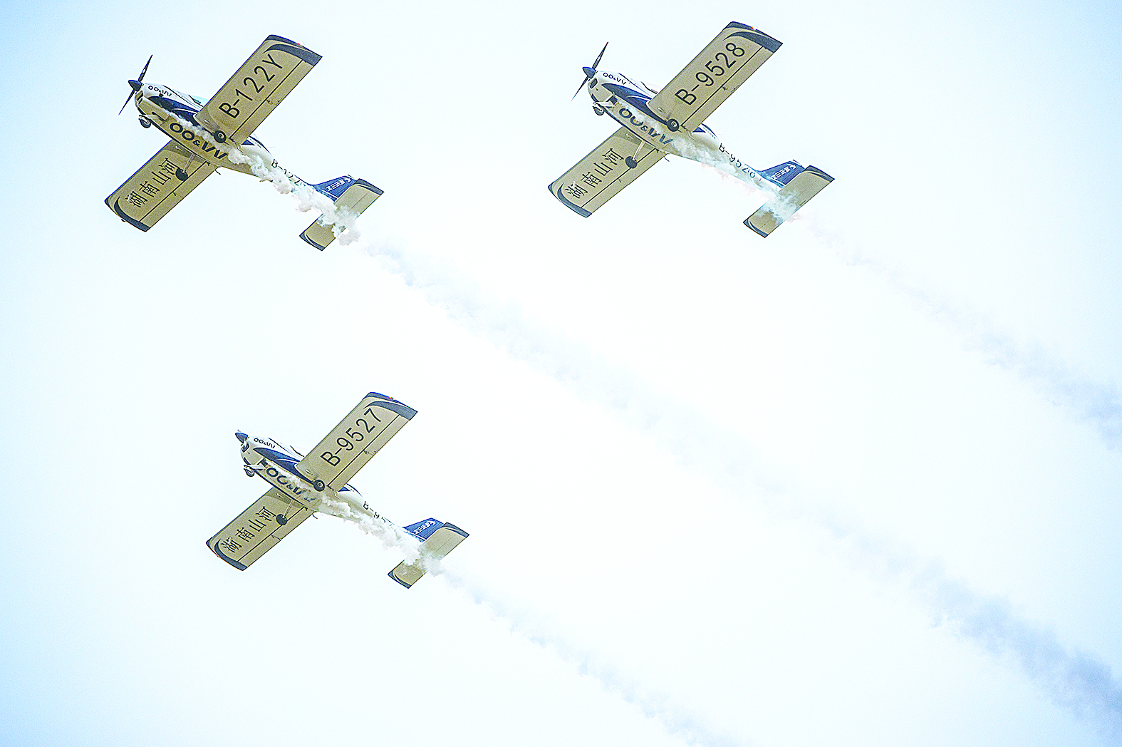 ▲湖南山河表演队驾驶着株洲产阿若拉飞机展翅翱翔。 郑安戈 摄