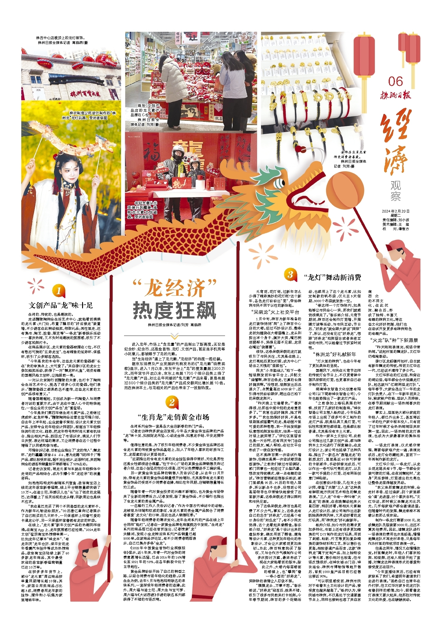 株百中心店楼顶上的龙灯装饰。 株洲日报全媒体记者 高晓燕/摄 神农制造公司设计制作的“株洲龙”龙灯玩具。 受访者供图 商场、文创产品店的龙元素产品摆在C位。 株洲日报全媒体记者 刘芳/摄 年轻夫妻从北京骑行到醴陵,选购龙元素文创瓷器。 受访者供图 金饰店生肖龙首饰受消费者喜爱。 株洲日报全媒体记者 刘芳/摄