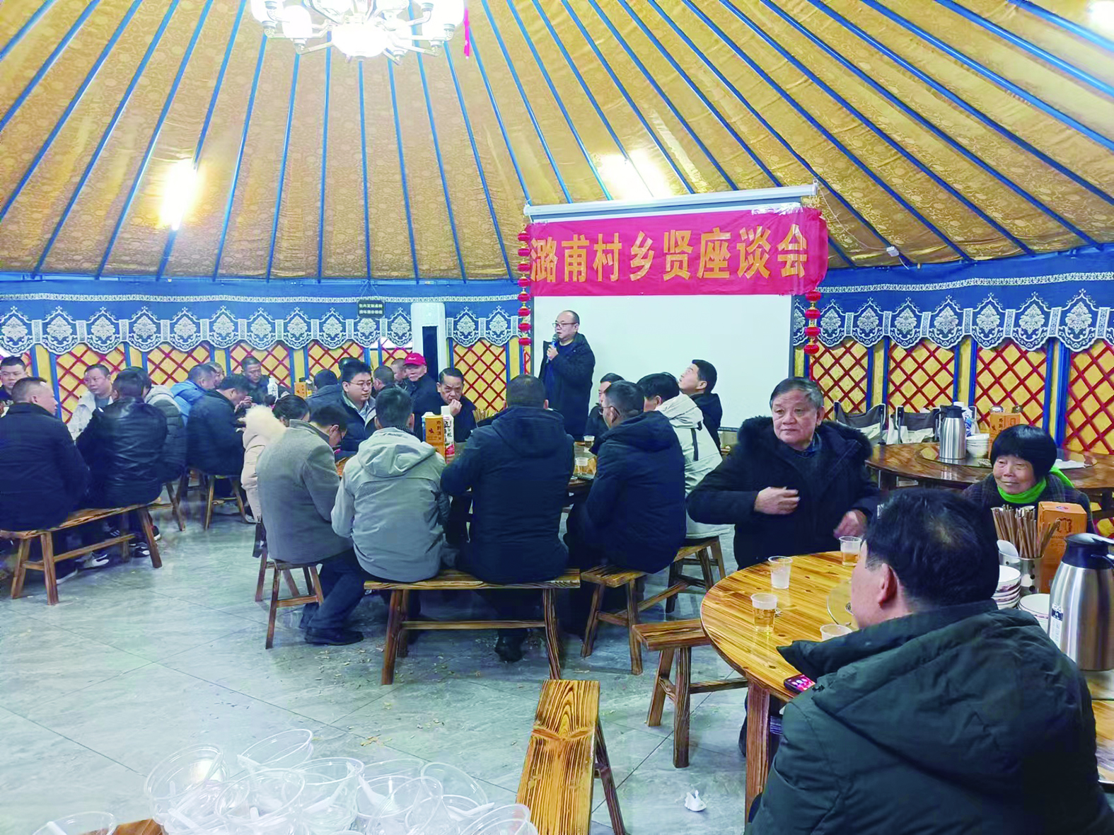 经过村干部半个月的对接和筹备,这天上午,村上的五十余位乡贤陆续赶来。温暖的蒙古包里,“潞甫村乡贤座谈会”开得火热,乡音你来我往,满斟的酒杯叮当碰撞。