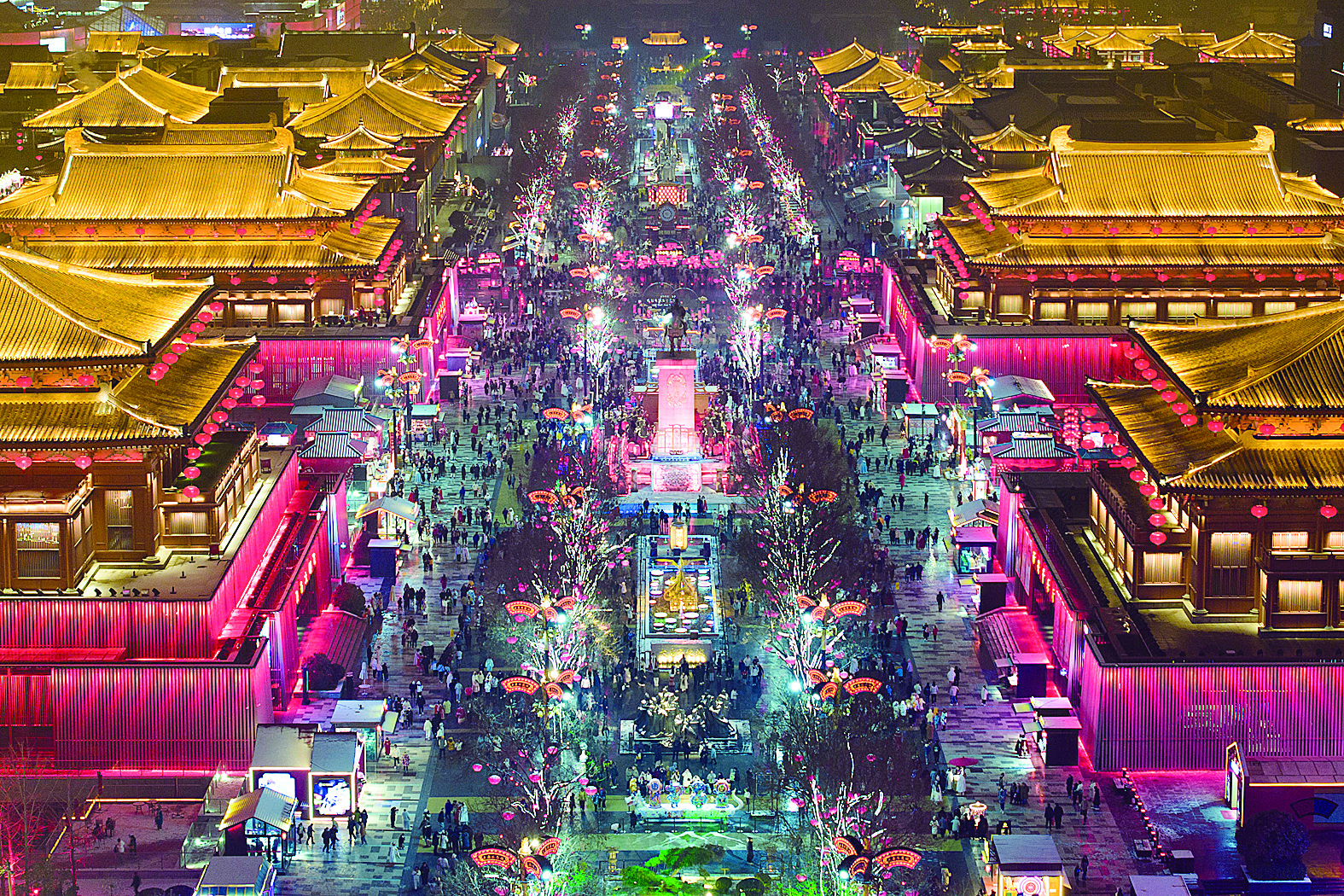 这是2024年2月2日拍摄的西安大唐不夜城景色(无人机照片)。新华社记者 邵瑞 摄